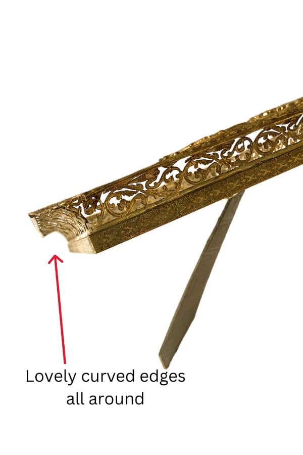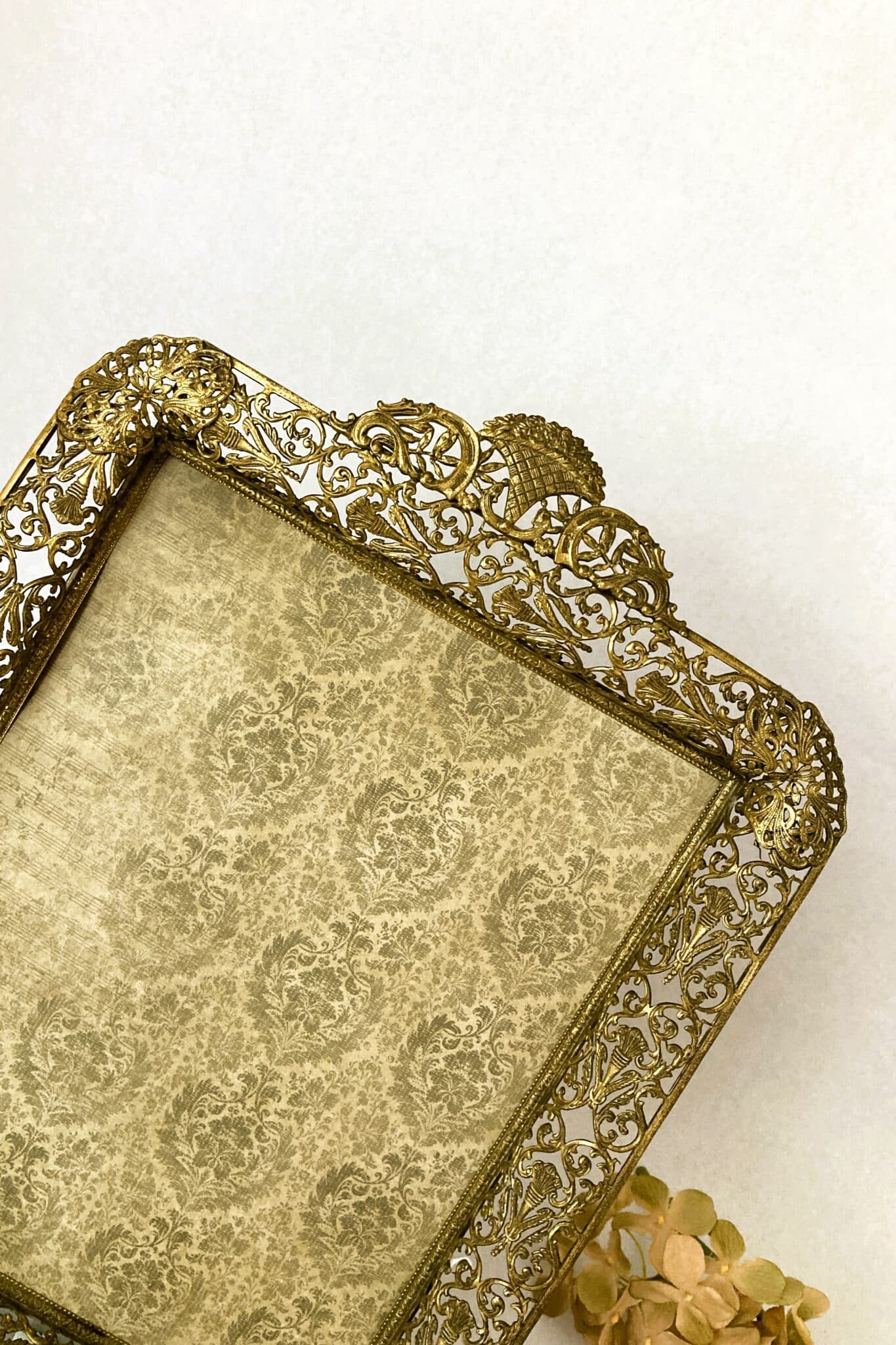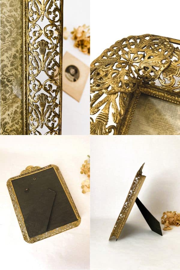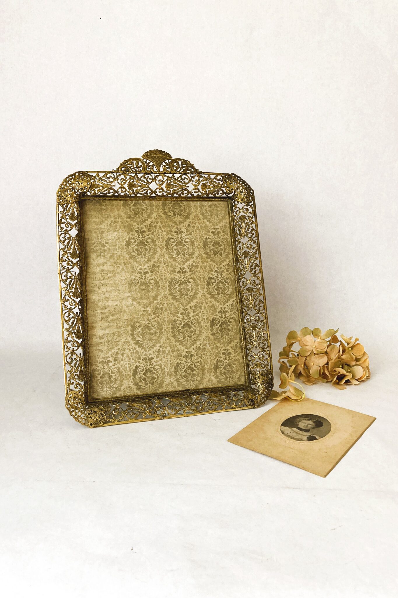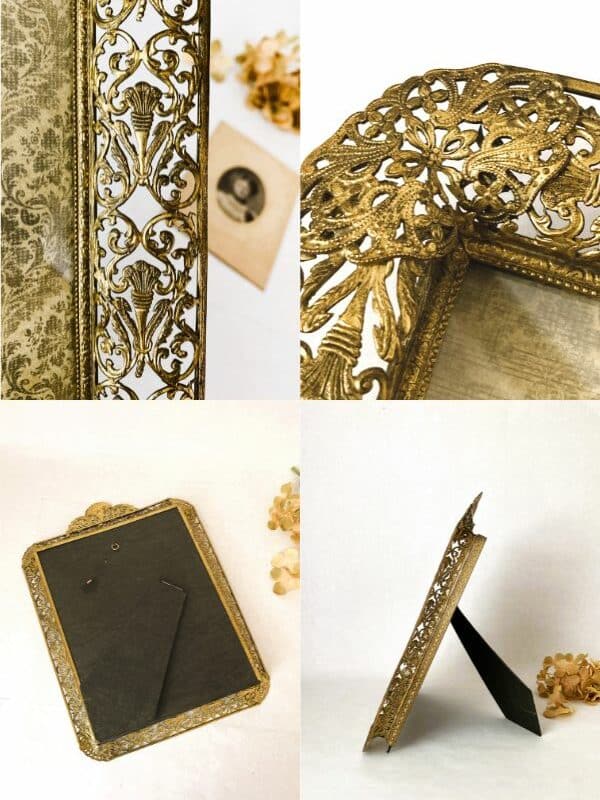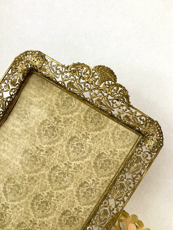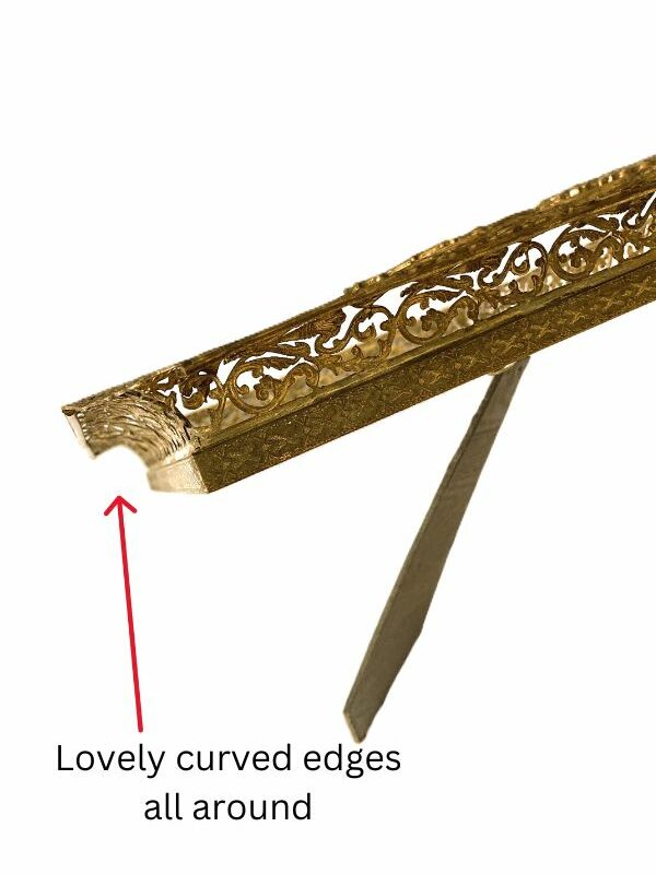 Beautiful ormolu filigree picture frame with kickstand and glass for tabletop use. The open metalwork features a scalloped top edge with basket as a focal point, and scattered throughout is a rich foliate design with scrolls and Prince-of-Wales Feathers. Intricate and rich. The lip surrounding the exterior of the glass has a beaded design, and the entire outer section (or “moulding” if it were a wooden frame) curves upward and out from the edge of the glass, creating a lovely flared edge–see photos.