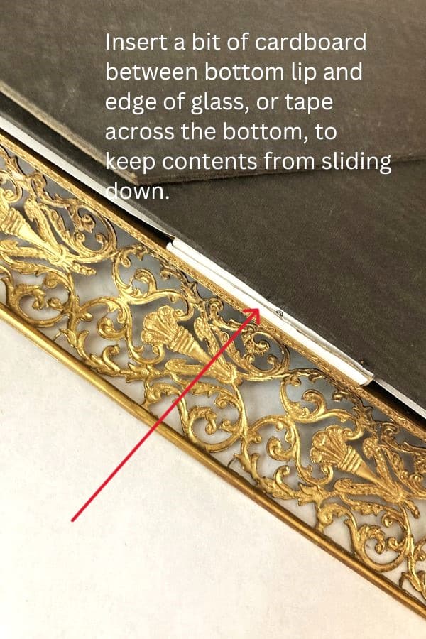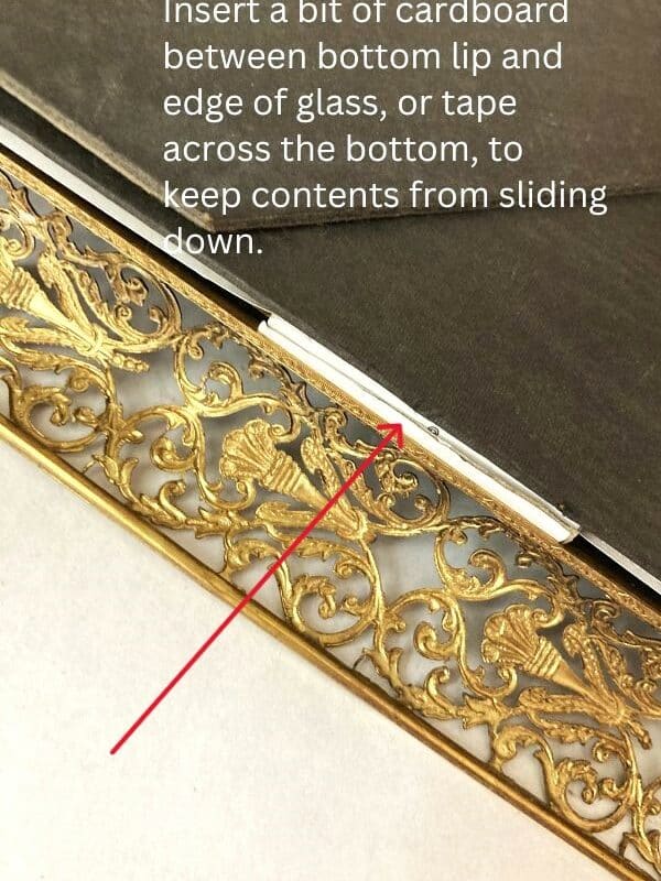 NOTE: the frame is in overall excellent used vintage condition with no damage; however, original to the construction is the absence of a “stop” at the bottom edge on the back, which allows the contents to slide downward. A bit of cardboard can be inserted between the bottom edge of the glass and the lip, or add masking tape across the bottom, to prevent this from happening–see last photo. Not recommended for wall display unless the contents can be properly secured.