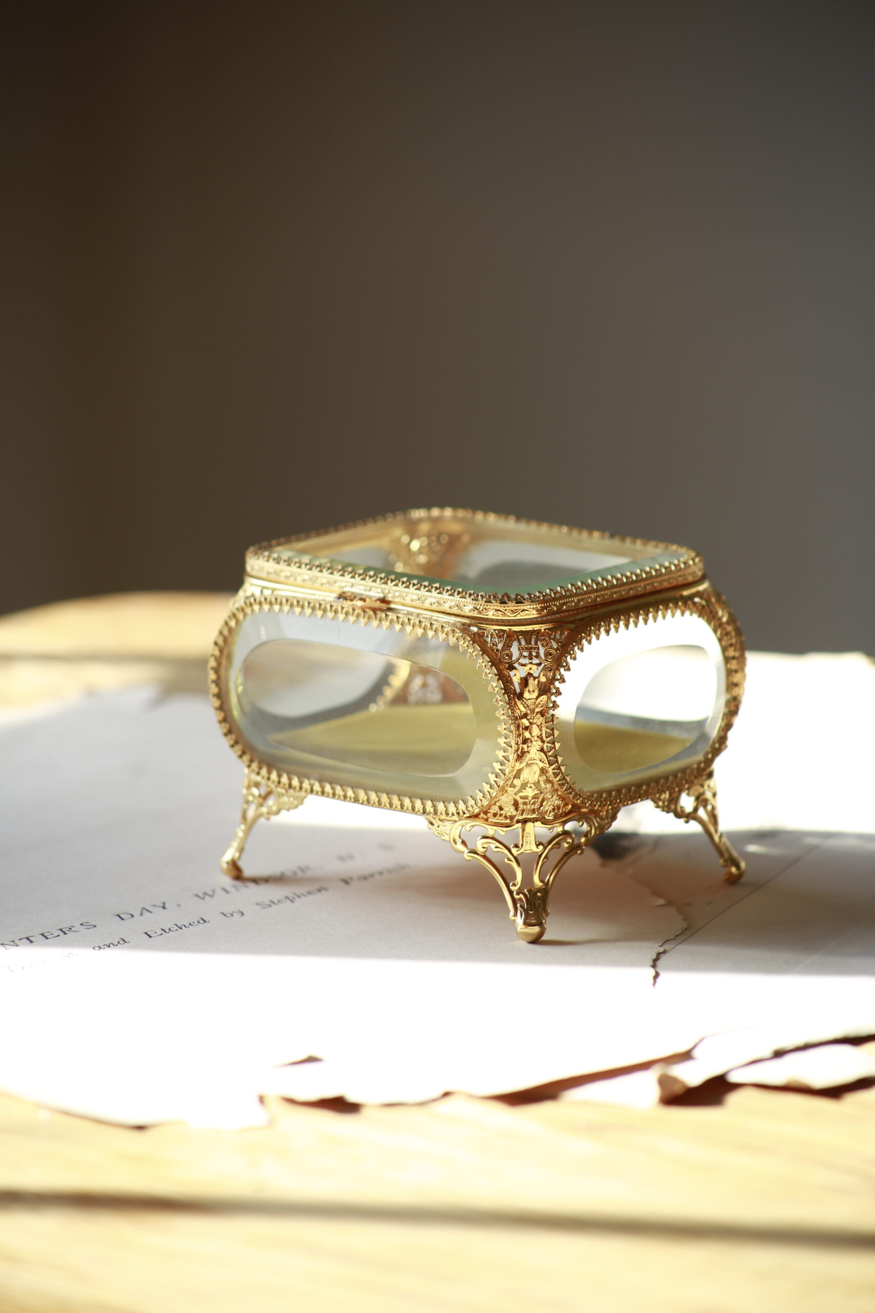 A stunning French jewelry casket box in ormolu or gilt. Lined on the inside with a mustard yellow velvet. Glass is original beveled glass in excellent condition. Overall ready to use and a stunning addition to any tabletop collection.