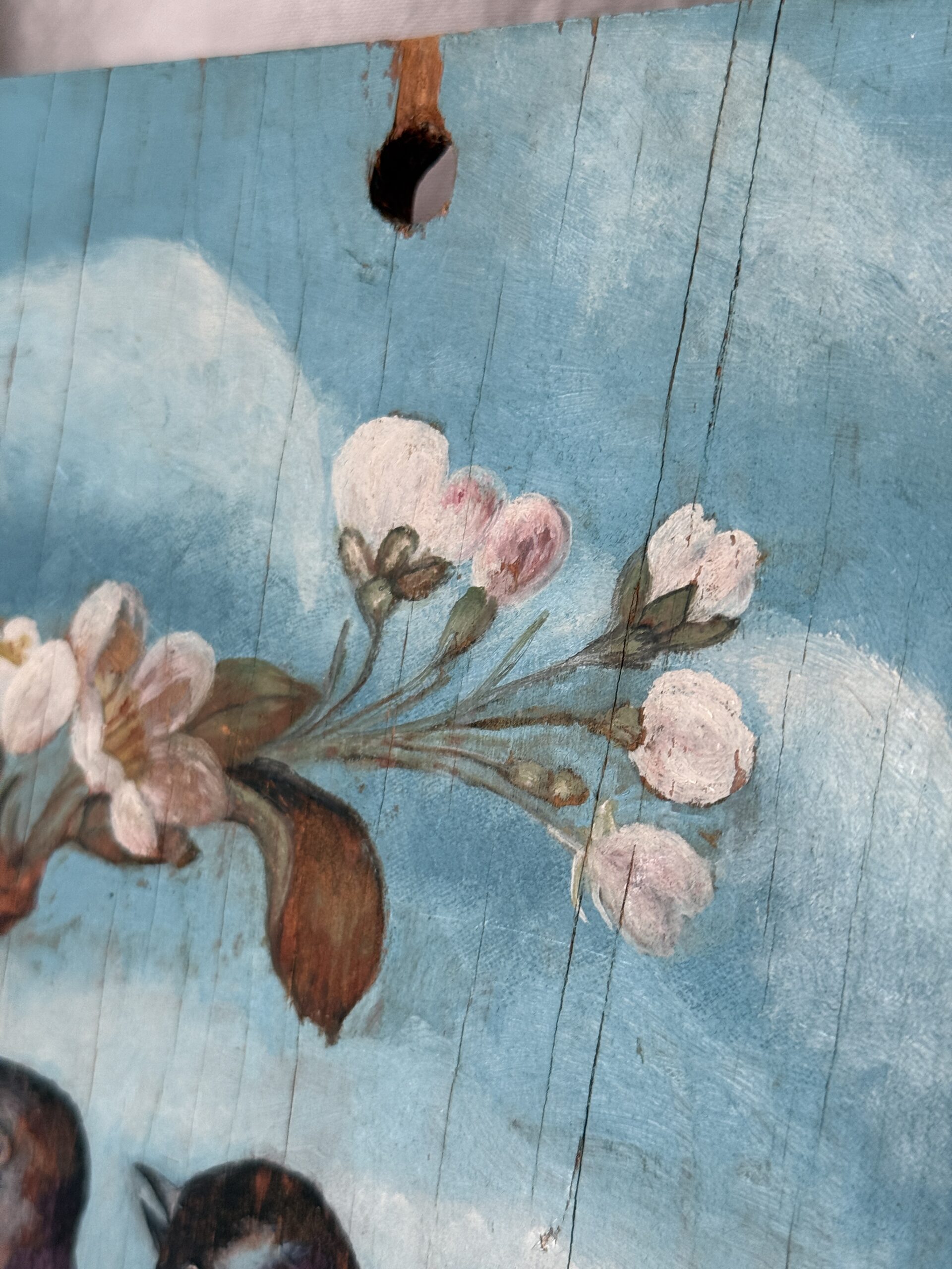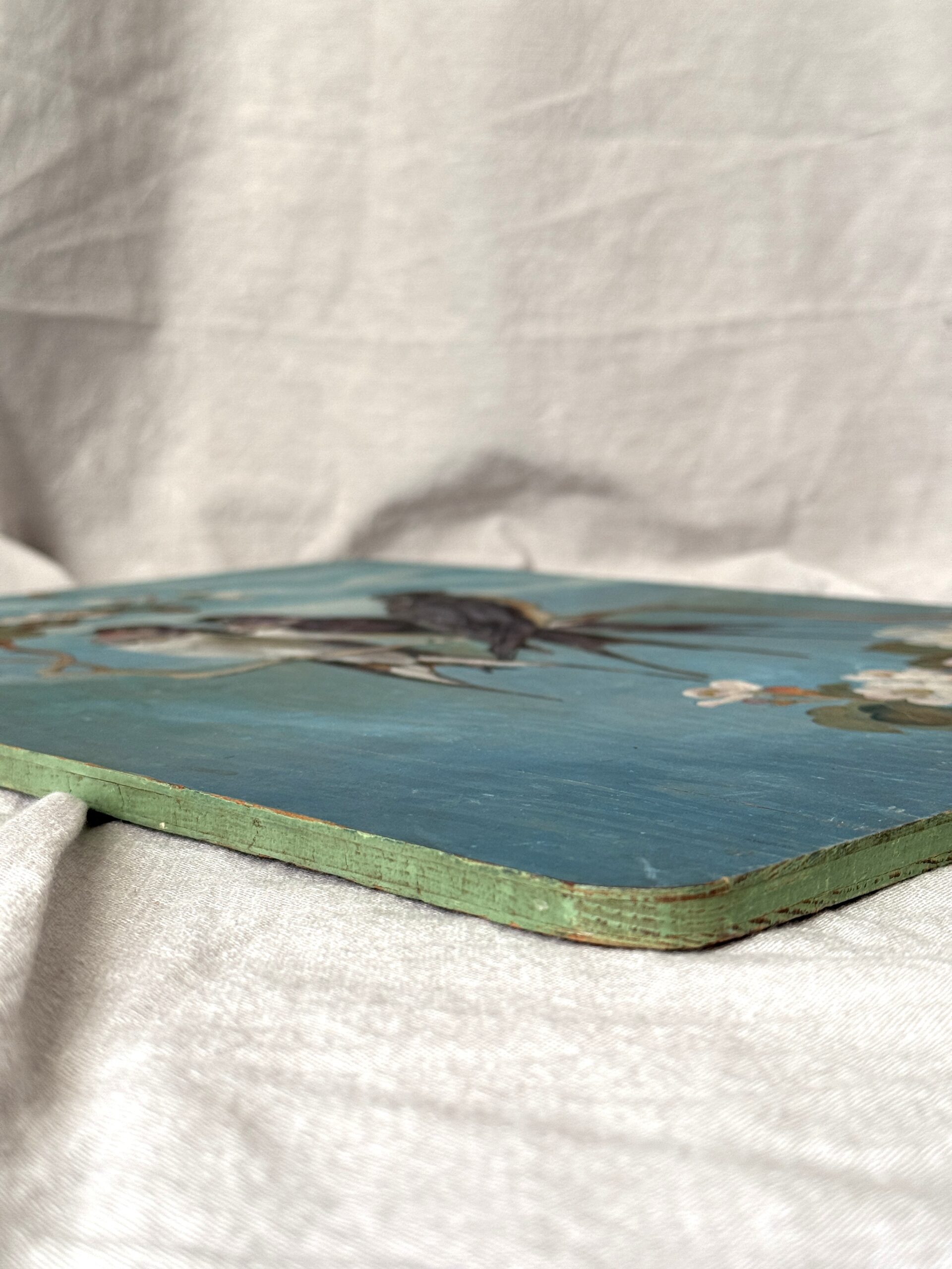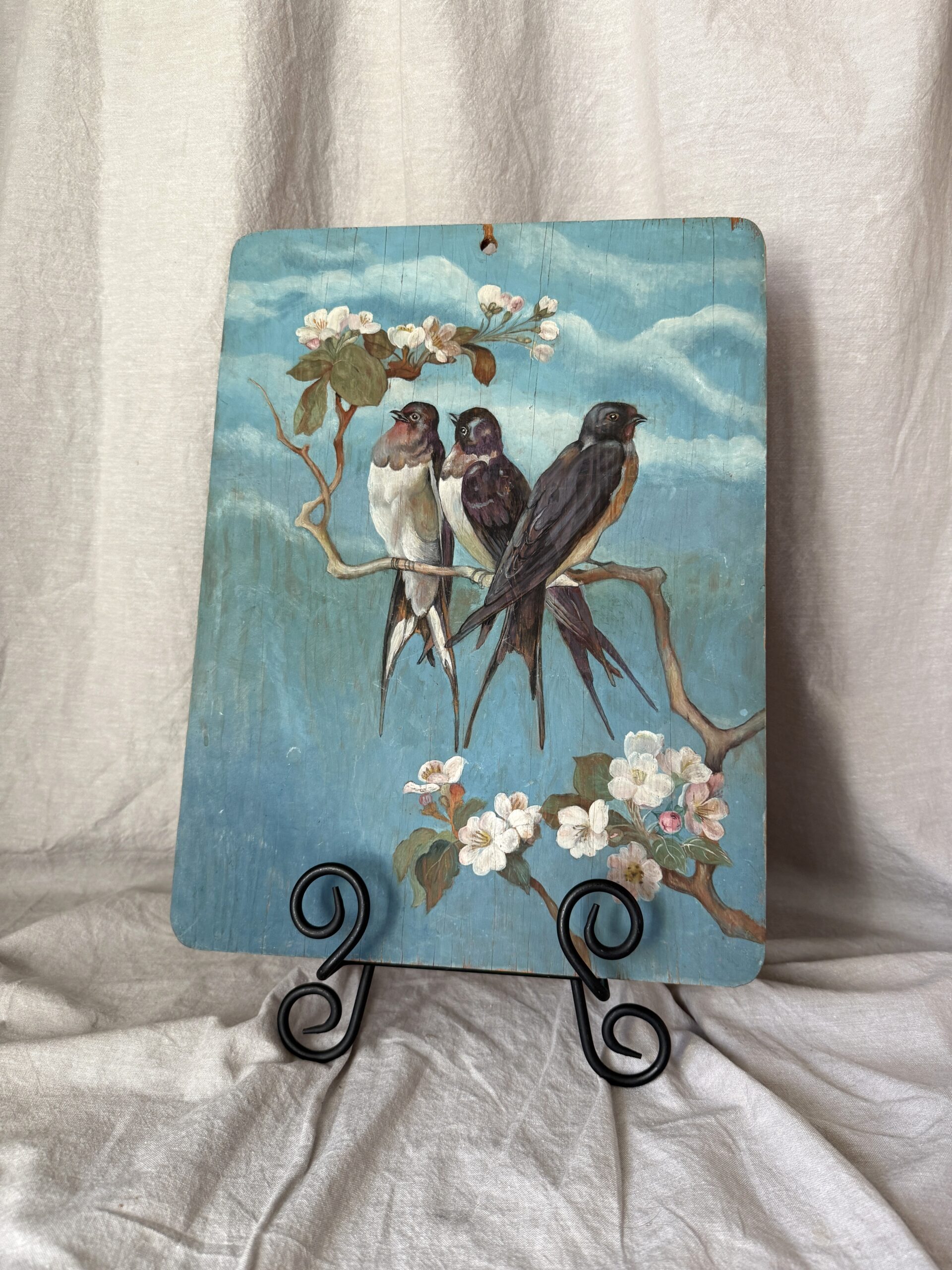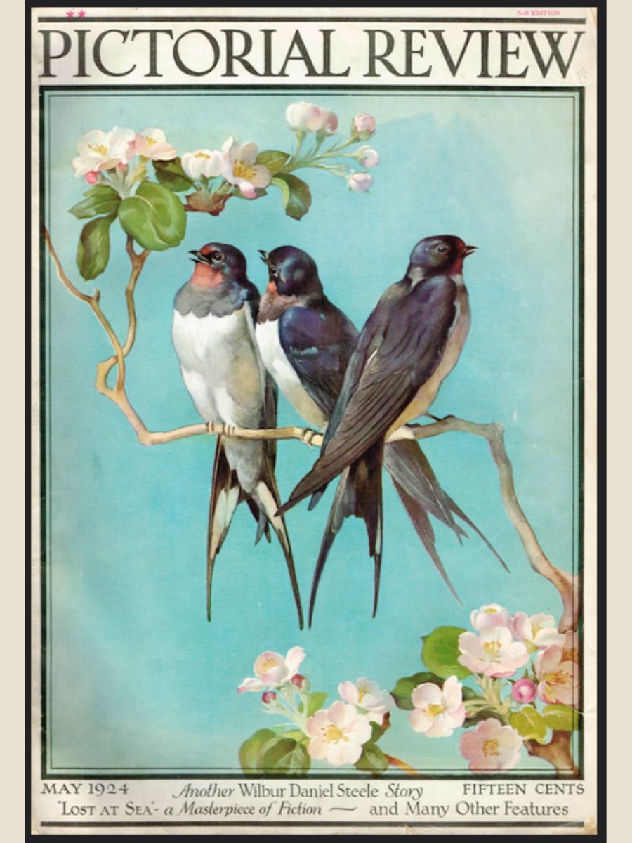 A most charming vintage painting of three swallows perched on a cherry blossom branch. Based on research, the image first appeared on the May 1924 cover of PICTORIAL REVIEW, a women’s magazine founded in 1899 which ran until 1937 (see last photo). This painting is a faithful reproduction of that image–I have been unable to determine who created the original art, both the one that appeared in the magazine and this one. It’s hard to tell what the medium is–it’s applied very thinly but with great skill, creating visual depth and texture. The wood is plywood, left untreated in the back. There’s a hole at the top for hanging; thread your own ribbon through it for a unique accent. It measures 16″ x 12″ x 3/8″ and is in very good preowned vintage condition. There are hairline splits on the top surface consistent with the age of the wood and some water staining in the back. I estimate it dates from as early as 1925 to the mid-20th century.