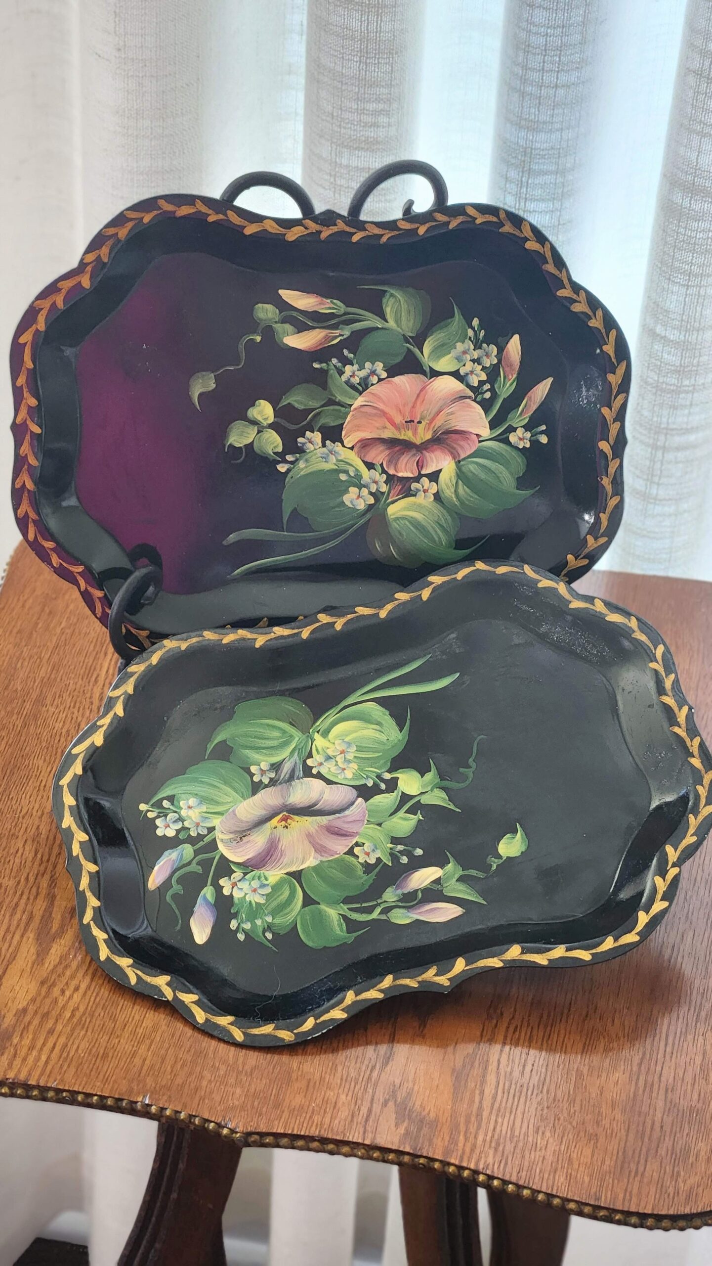 Pr. of black metal tole trays with painted floral design. Measures 9 1/2″ x 7″ x 1″