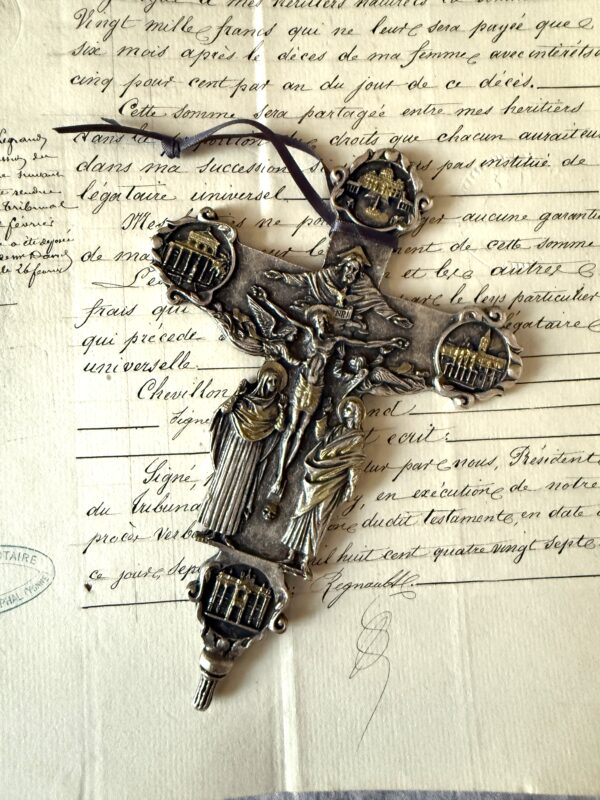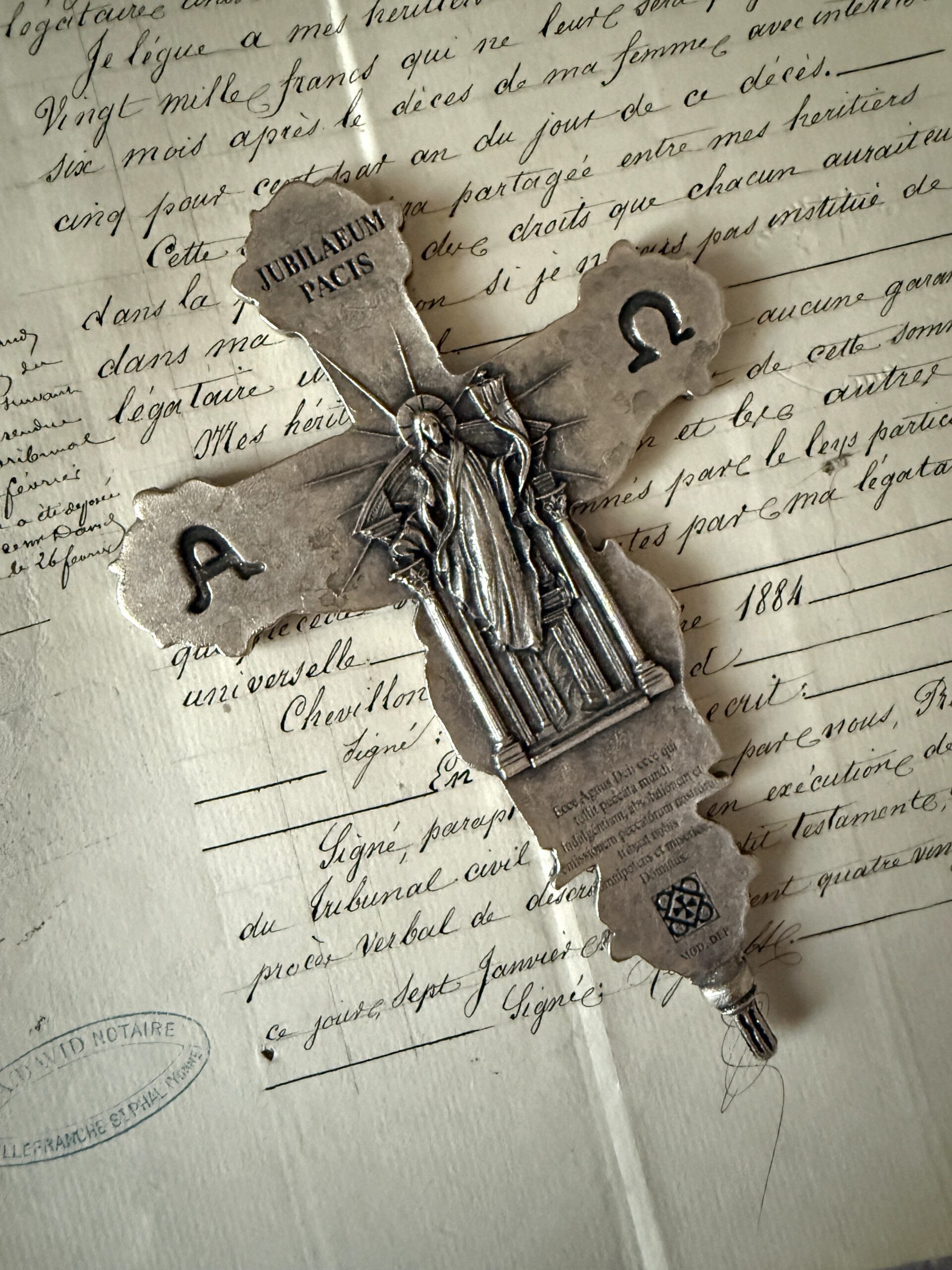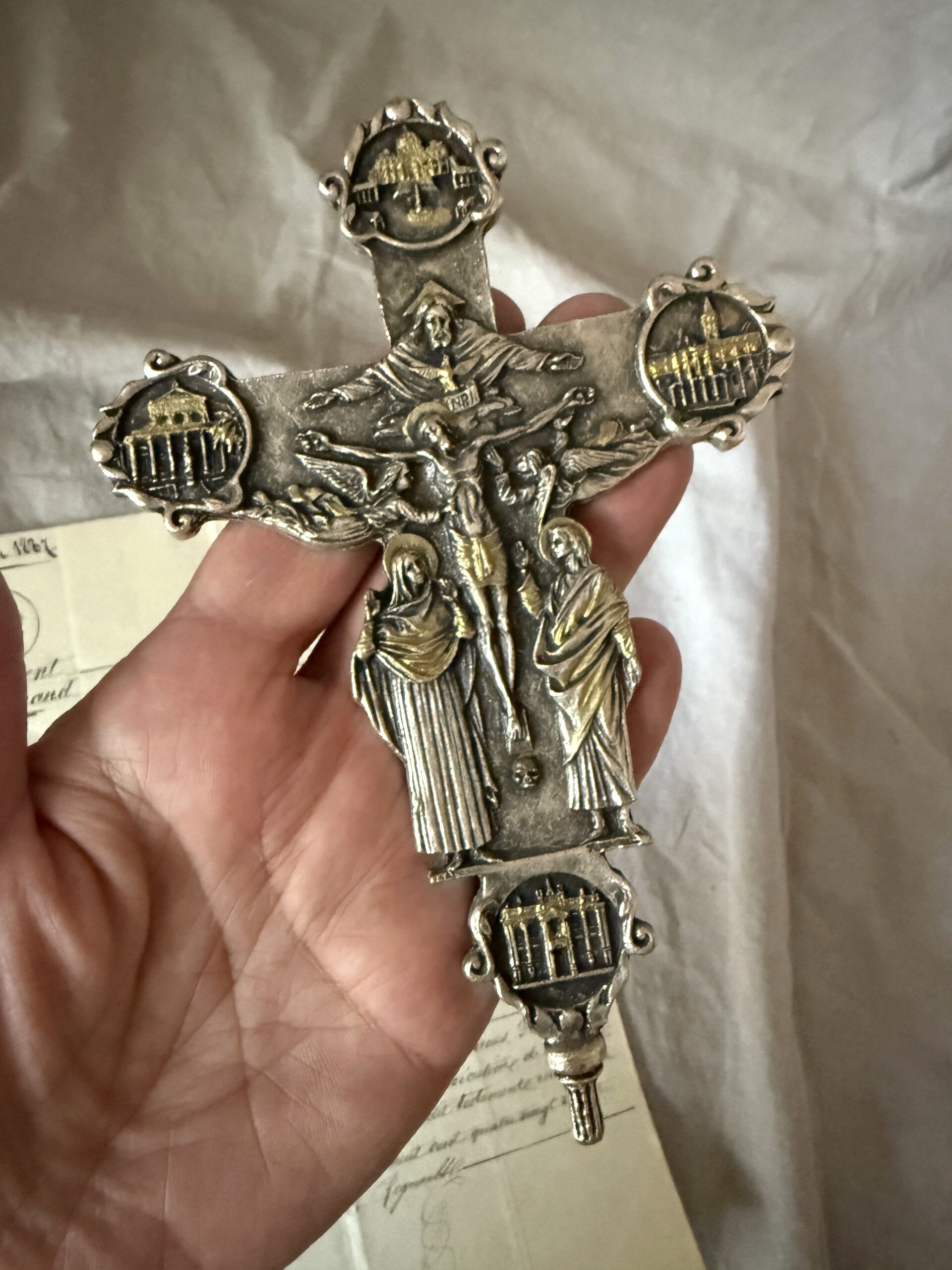 Vintage heavy cast metal crucifix from the year 2000 Peace Jubilee. Highly detailed relief work, featuring Christ on the cross on the front with Mary and John on either side; God the Father and the Holy Spirit as the dove of peace above; Rome’s four basilicas: St. Peter’s at the top, St. John Lateran at the bottom, St. Mary Major on the right, and St. Paul Outside the Walls on the Left, all of which play a role during pilgrimages of jubilee year. The back features the words Jubilaeum Pacis (Peace Jubilee), the theme proclaimed by Pope John Paul II for the year 2000 at the top; the Greek letters Alpha and Omega on the left and right, respectively. In the center there is a detailed image of Christ with a victory banner rising above the Holy Doors which are opened by the Pope to mark the jubilee celebration; and below it the Latin inscription: Ecce Agnus Dei: ecce qui tollit peccata mundi. Indulgentiam, absolutionem et remissionem peccatorum nostrorum, tribuat nobis omnipotens et misericors Dominus. (Behold the Lamb of God, behold Him who takes away the sins of the world. May the Almighty and merciful Lord grant us pardon, absolution, and remission of our sins.) The words Mod. Dep. (Modello Depositato), an Italian copyright or patent. The cross may be made of pewter and is plated with a silver-color metal and gold-color accents on the front. I’ve added a ribbon for hanging. It measures 6-3/8″ x 4.25″ and is in excellent preowned vintage condition. It’s a beautiful piece, likely obtained in Rome during the 2000 Jubilee and holds great significance for those of the Catholic faith. Style it on a book or a Bible on the coffee table or nightstand; gift it to a special someone.