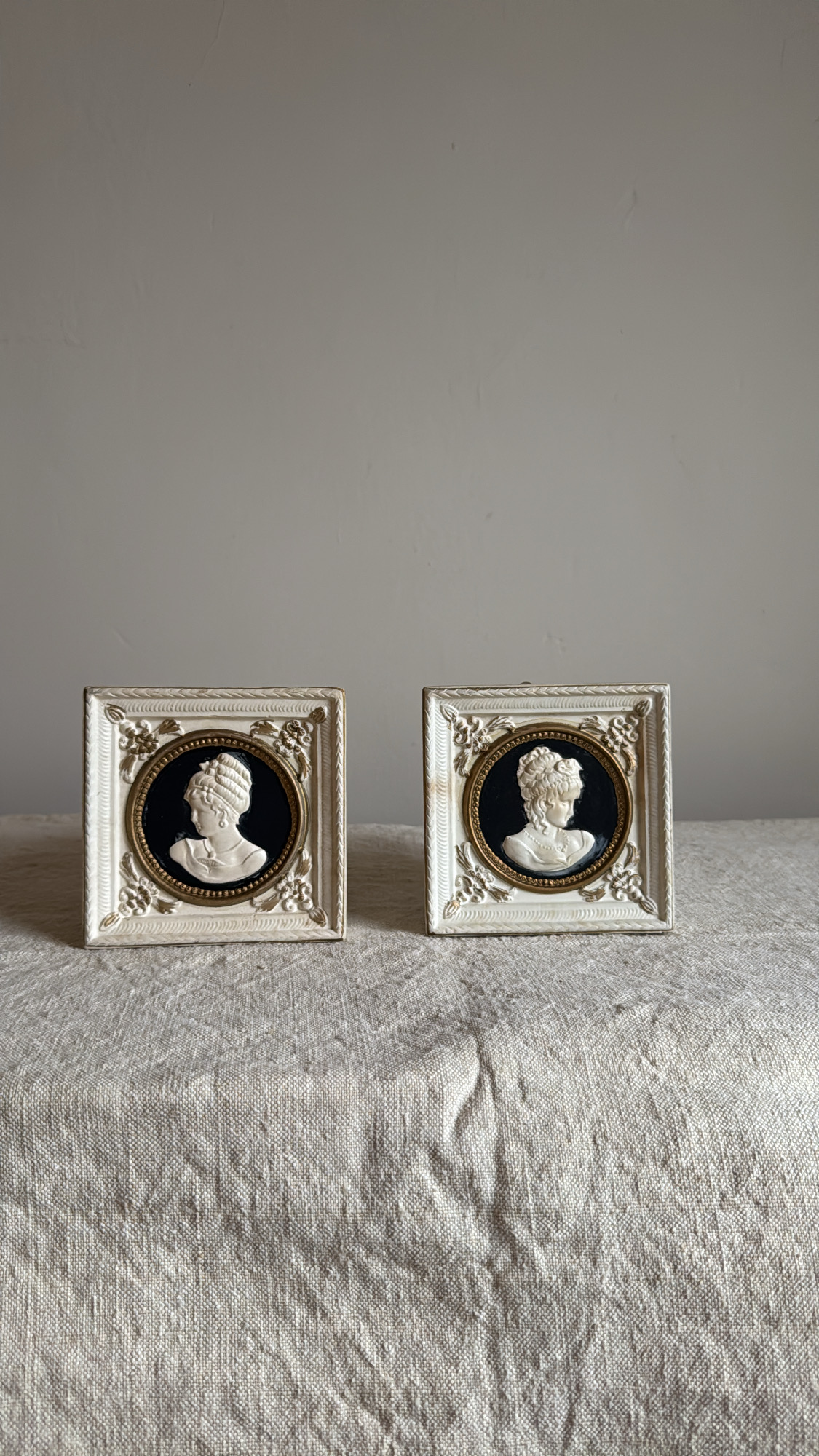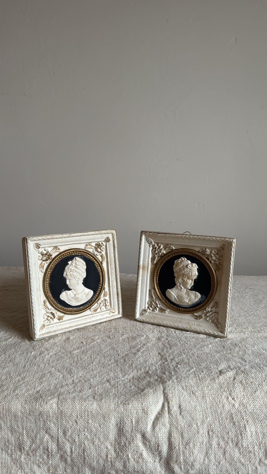 A refined pair of porcelain cameo busts set in ornate ivory-toned porcelain frames with gold detailing. Each piece features a delicately sculpted profile against a contrasting black ground, evoking neoclassical elegance. Perfect as wall decor or displayed on a shelf for a touch of timeless European charm. They already have wire on the back and are ready to hang. Hand-painted, so they have an imperfect finish (see images)