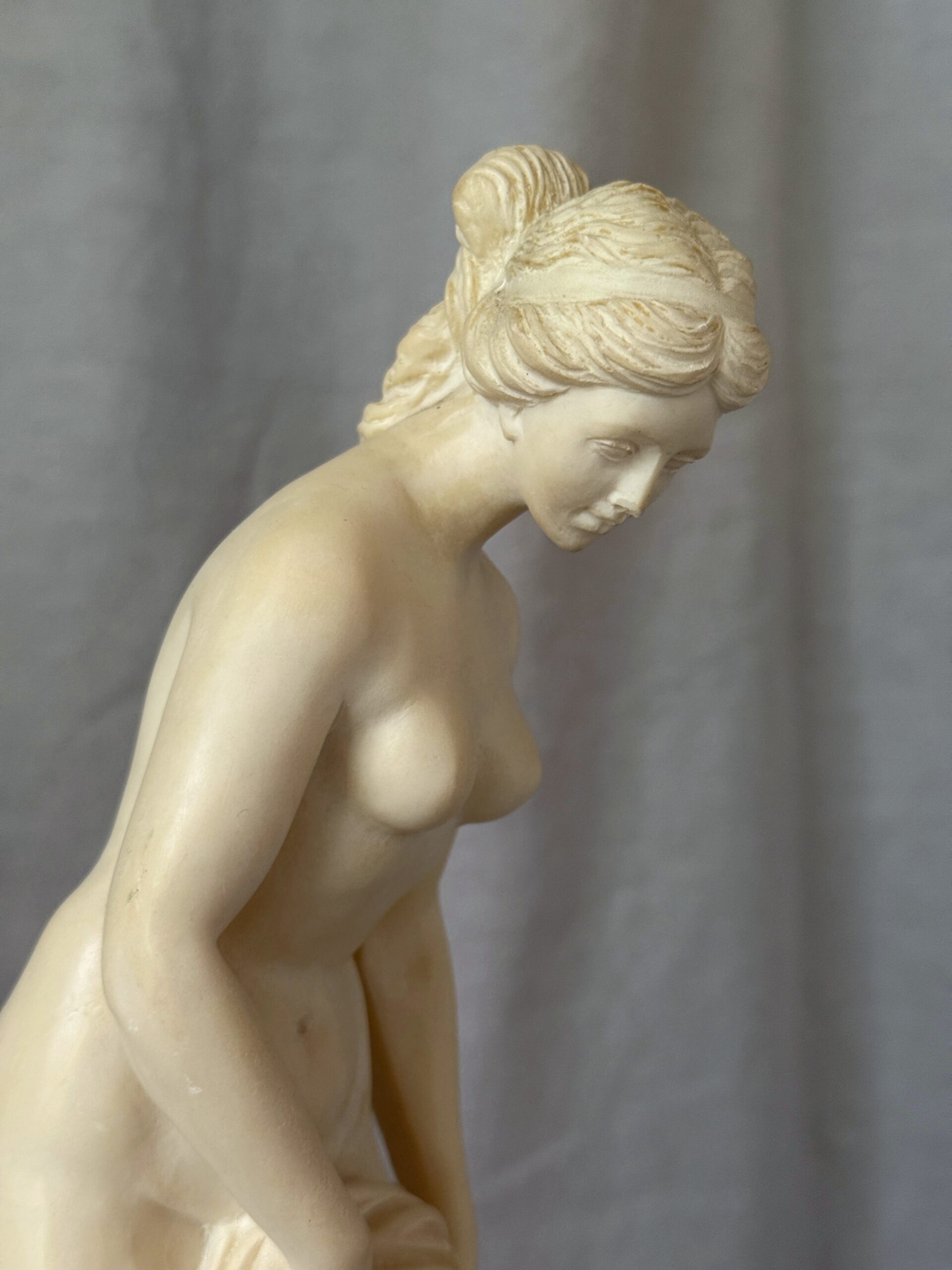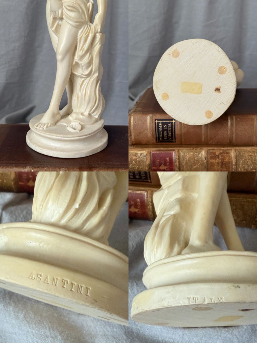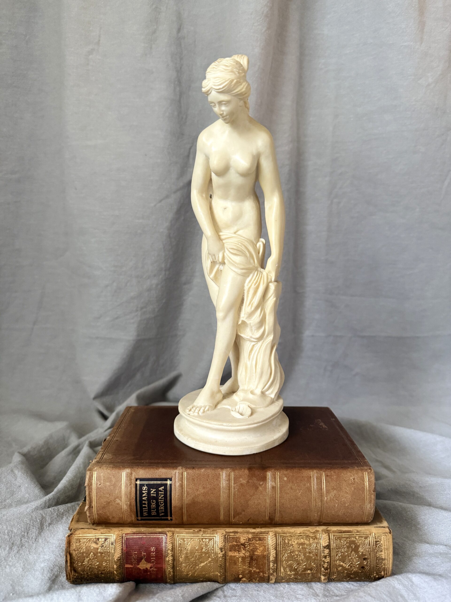 Vintage reconstituted alabaster sculpture of the “Bathing Venus” (Aphrodite in Greek mythology) marked “A. Santini, Italy.” The sculpture is nicely detailed and includes a scallop shell, symbol of beauty and purity and reference to Venus’s birth from the sea as famously depicted in Sandro Botticelli’s painting, “The Birth of Venus.” It has a warm patina and stands 11.5″ tall; the round base measures 3-7/8″ in diameter. Very good preowned vintage condition (two tiny spots on her left elbow and “bum”).