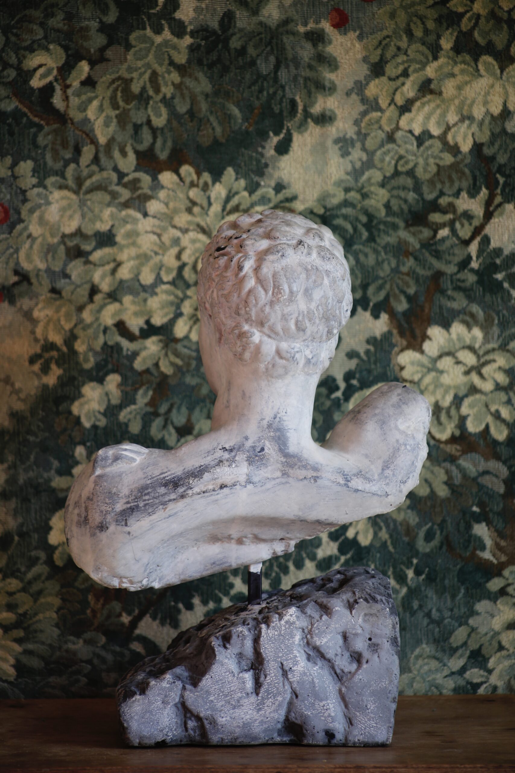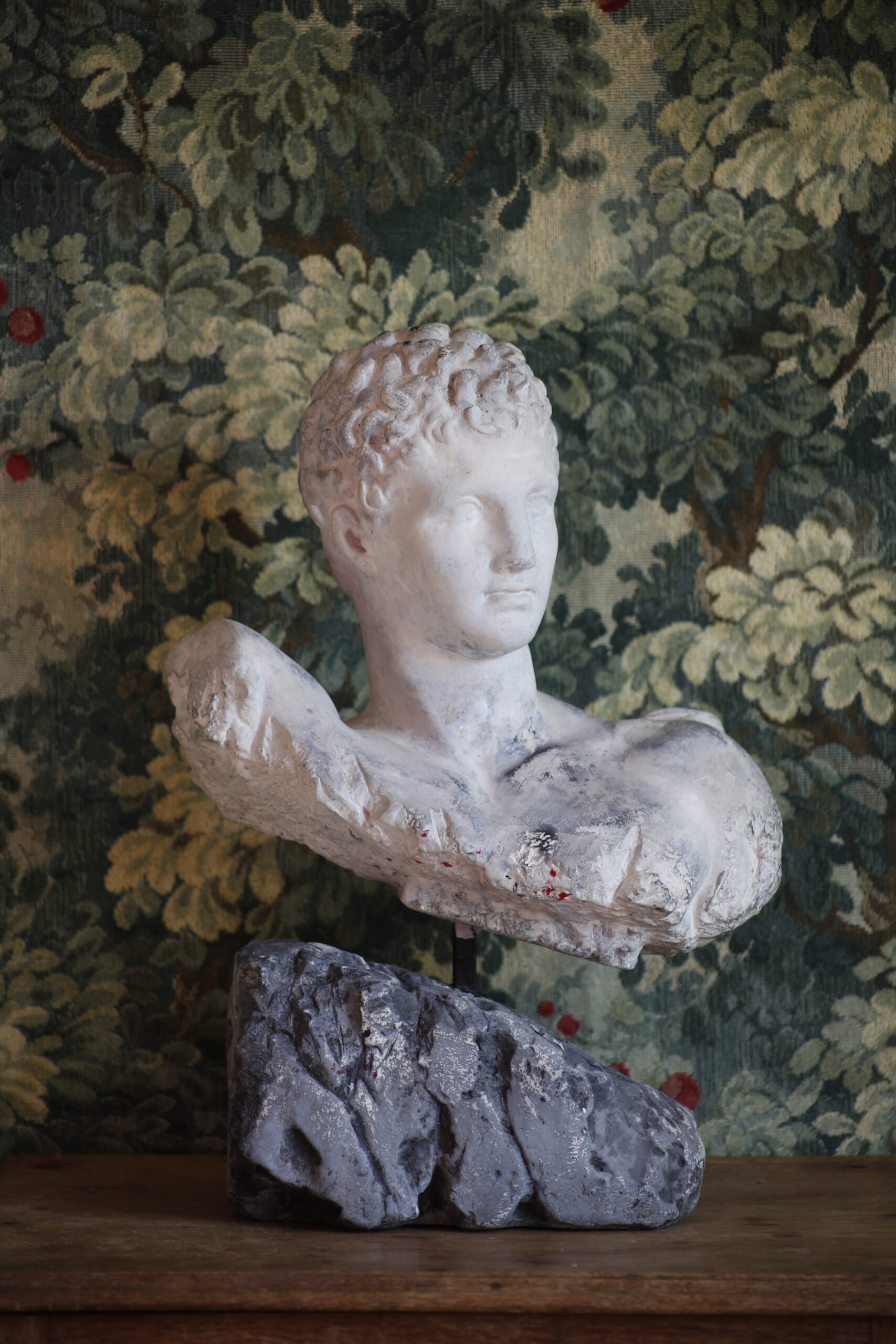 This is an Attila’s reproduction sculpture of Hermes most likely in cast stone. It is HEAVY and solid!! Atilla’s is known for sculptures done in cast stone, plaster & ceramic. Overall in good condition with variations of wear throughout; no major damages to note.
