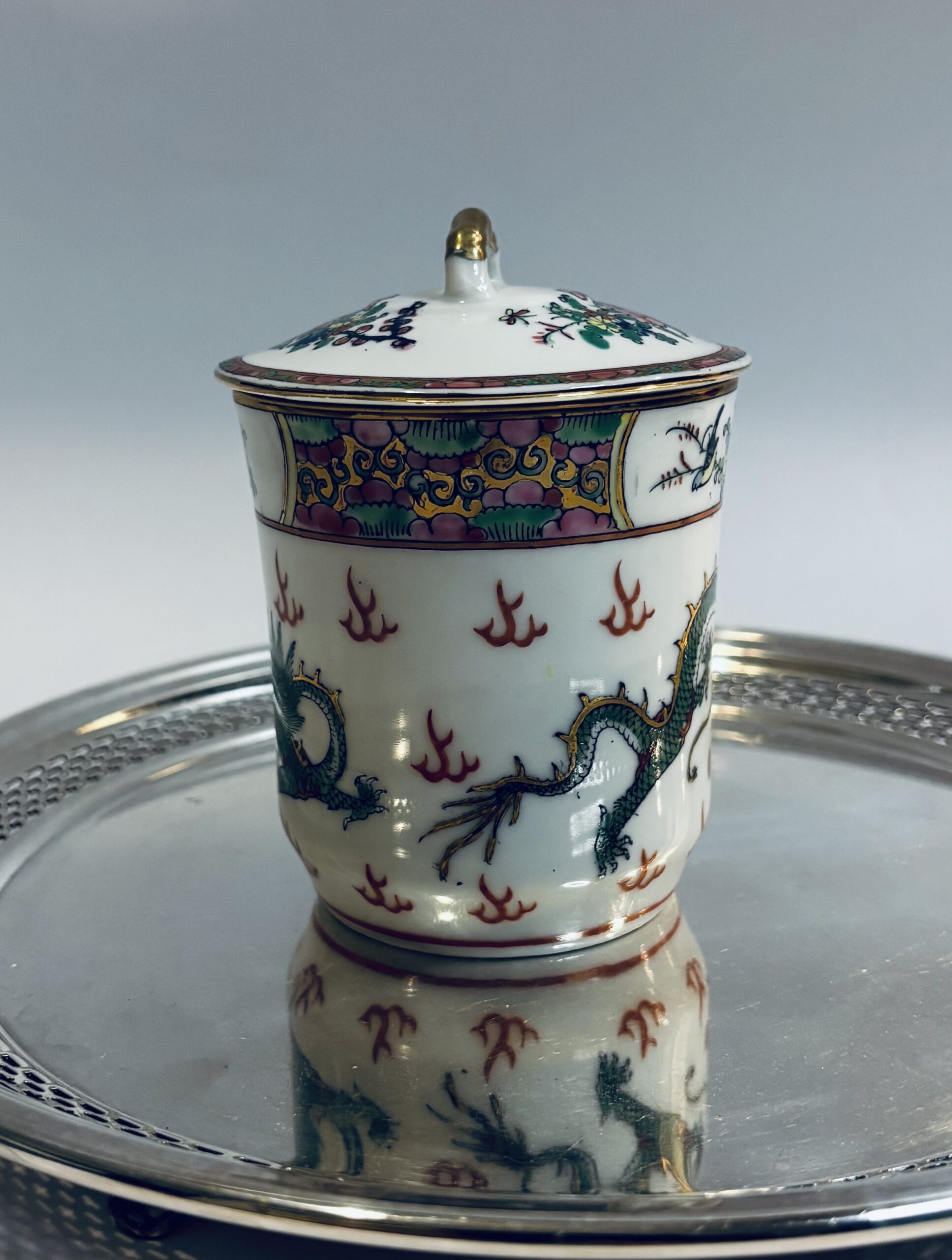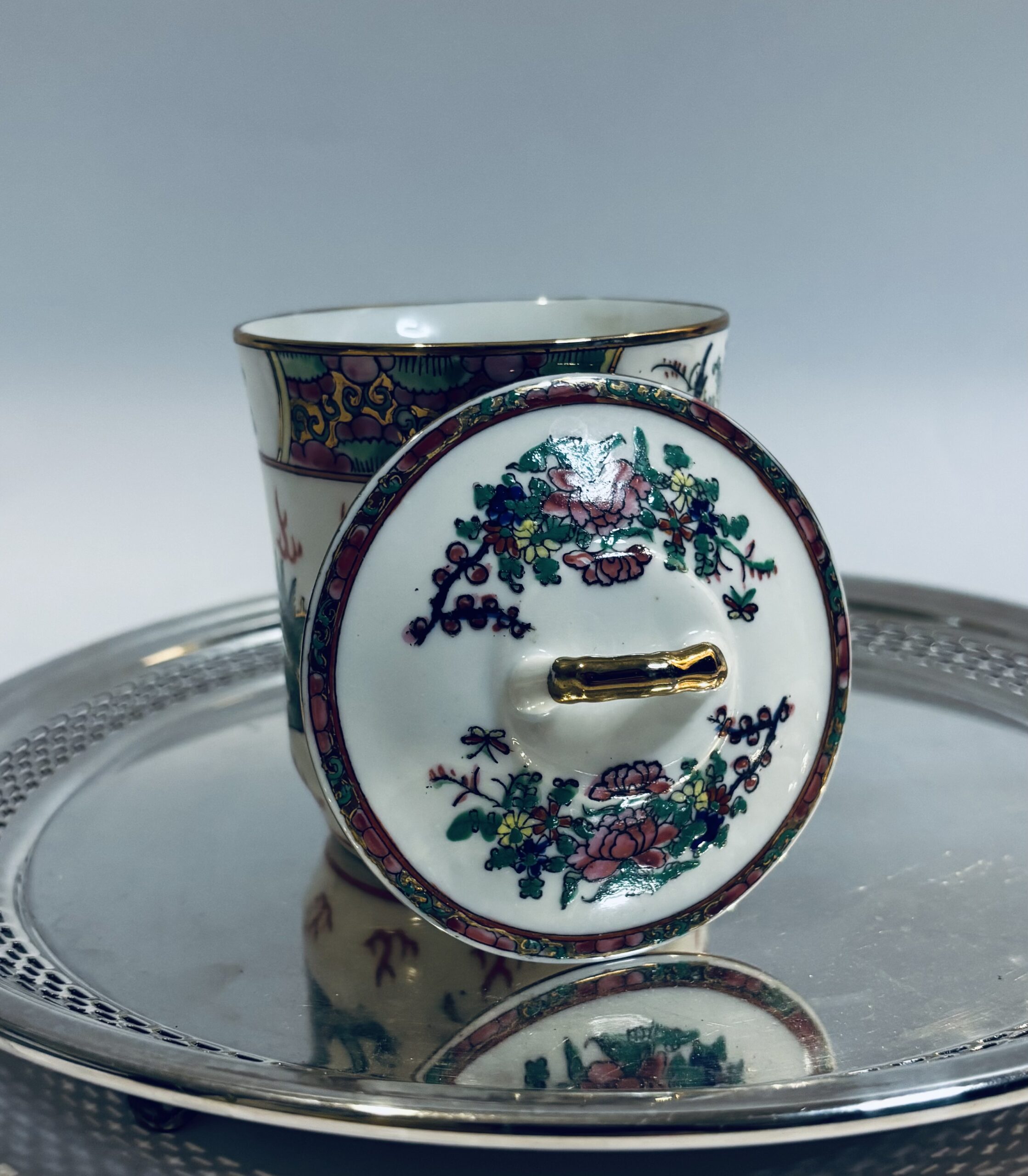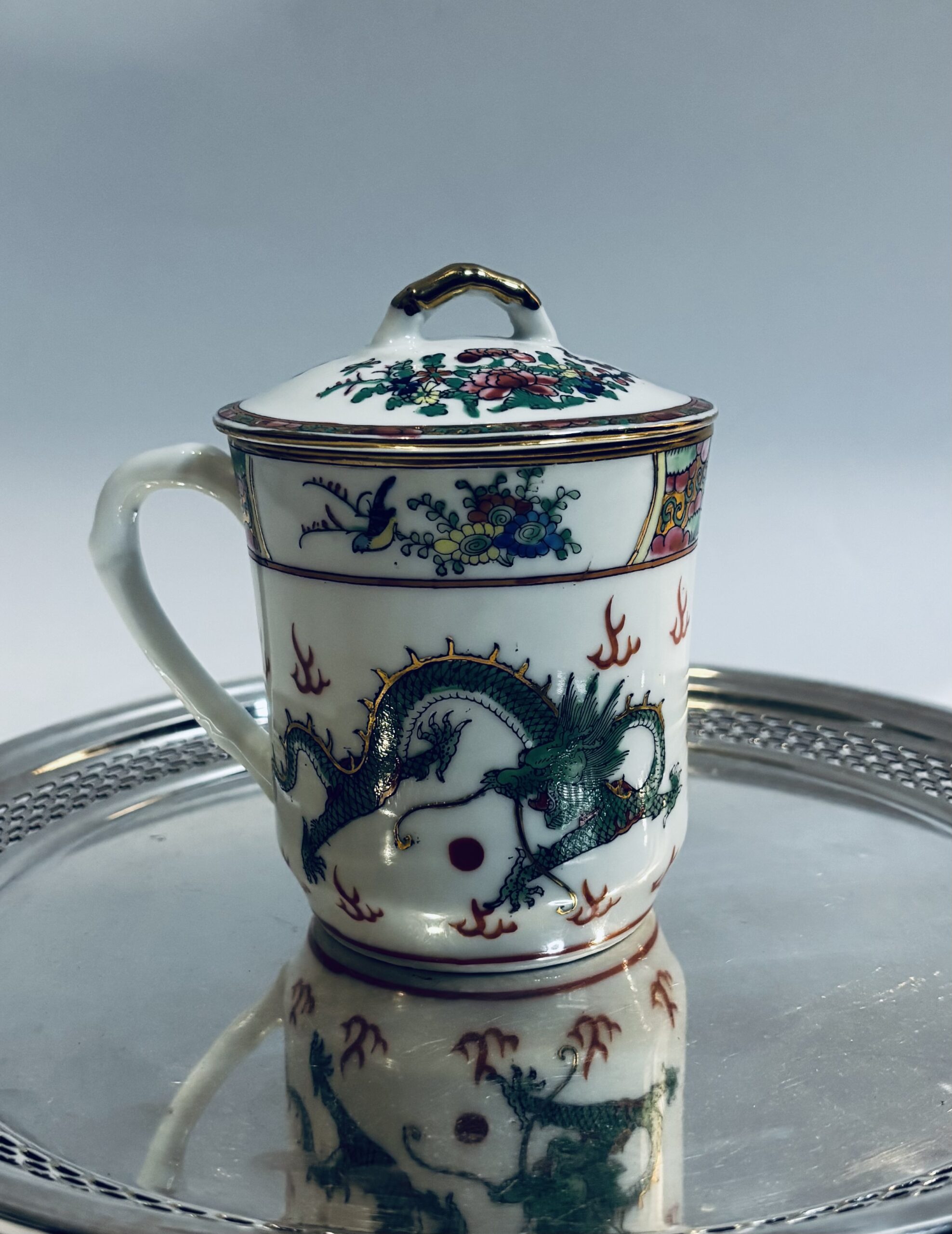 Sip in timeless style with this beautifully crafted Vintage Rose Medallion Tea Mug. Featuring the classic Rose Medallion motif—delicate florals, vibrant colors, and intricate hand-painted details—this mug brings a touch of elegance to your daily routine. The matching lid helps keep your tea warm and can double as a coaster for the infuser or spoon.