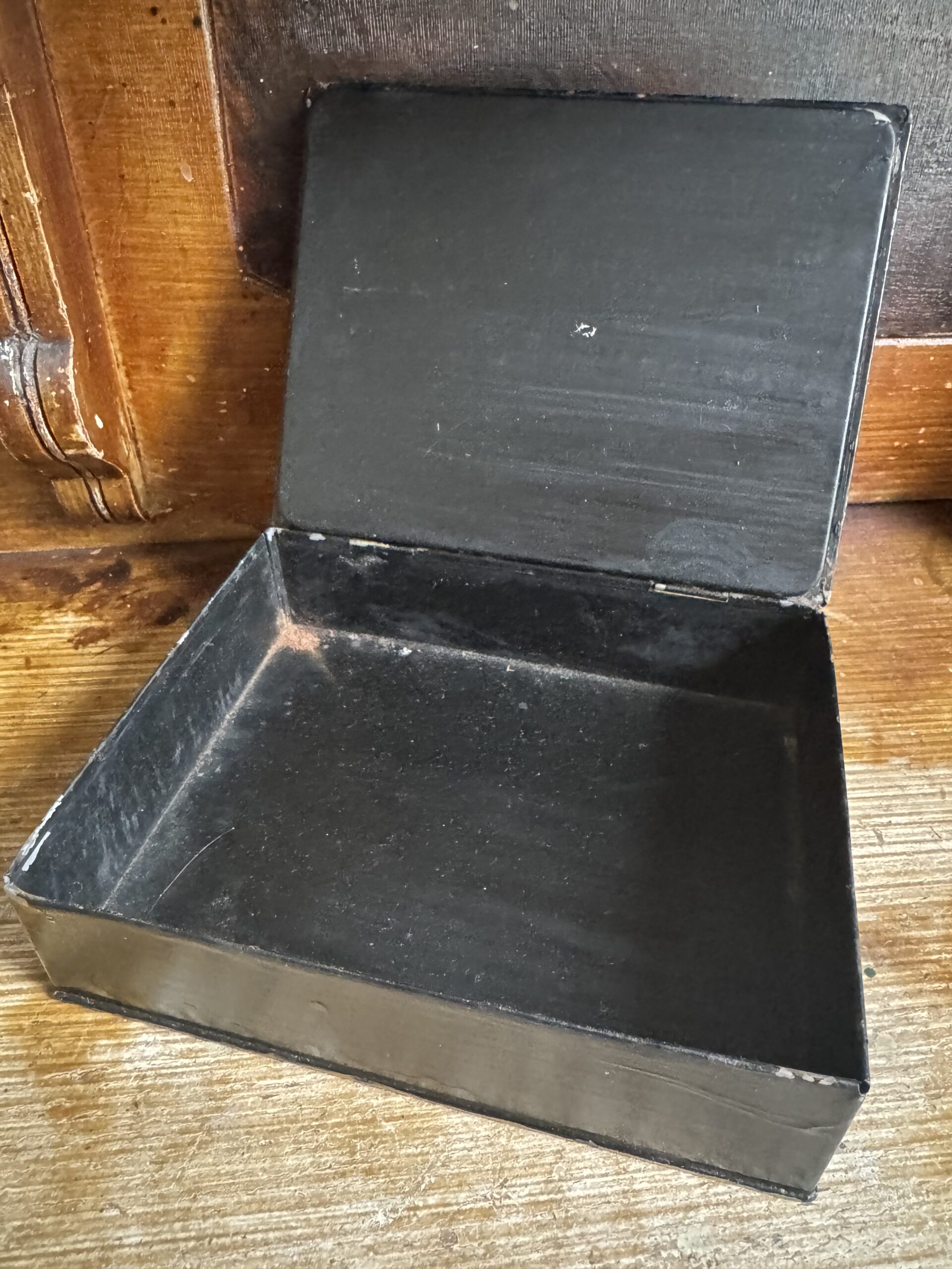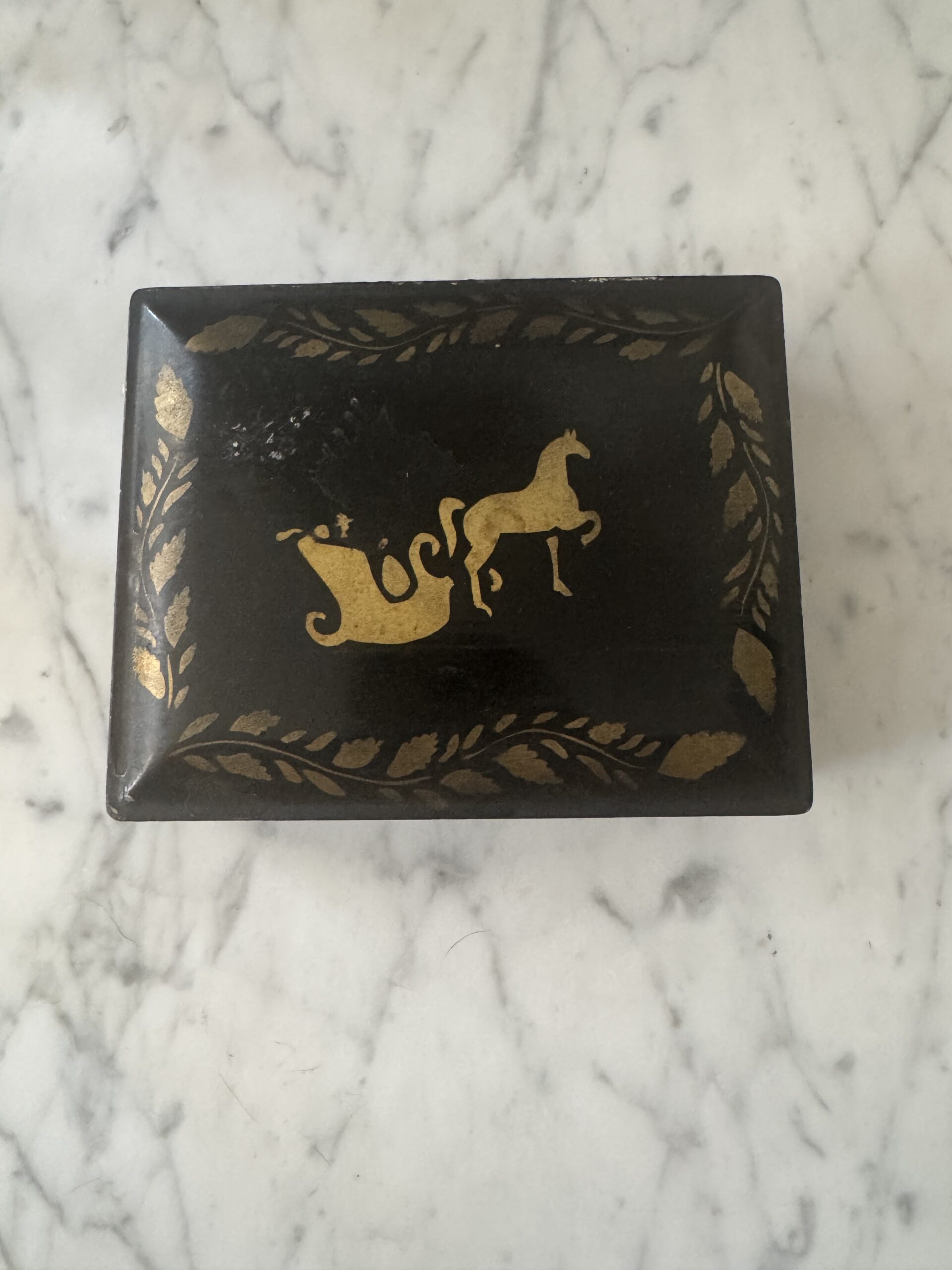 Black tin, lidded box with sweet gold painted details.
