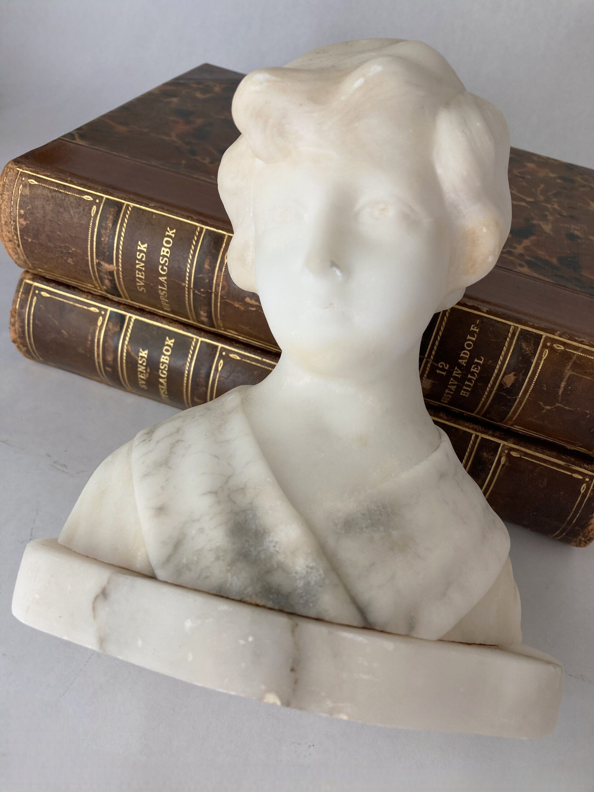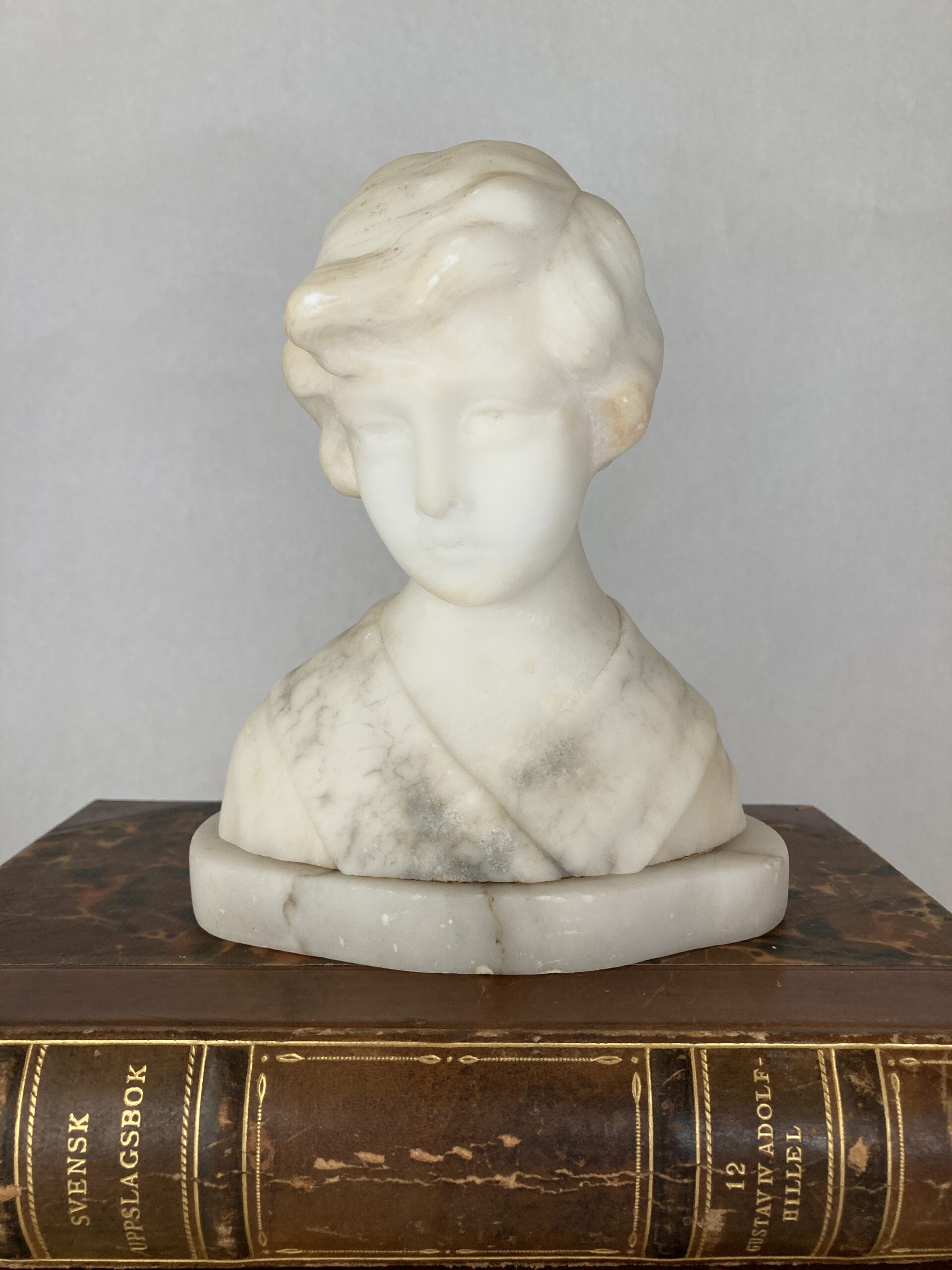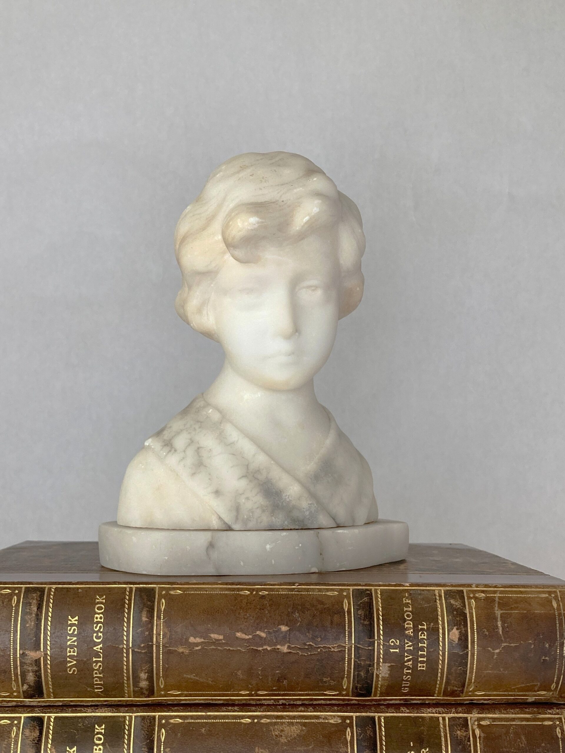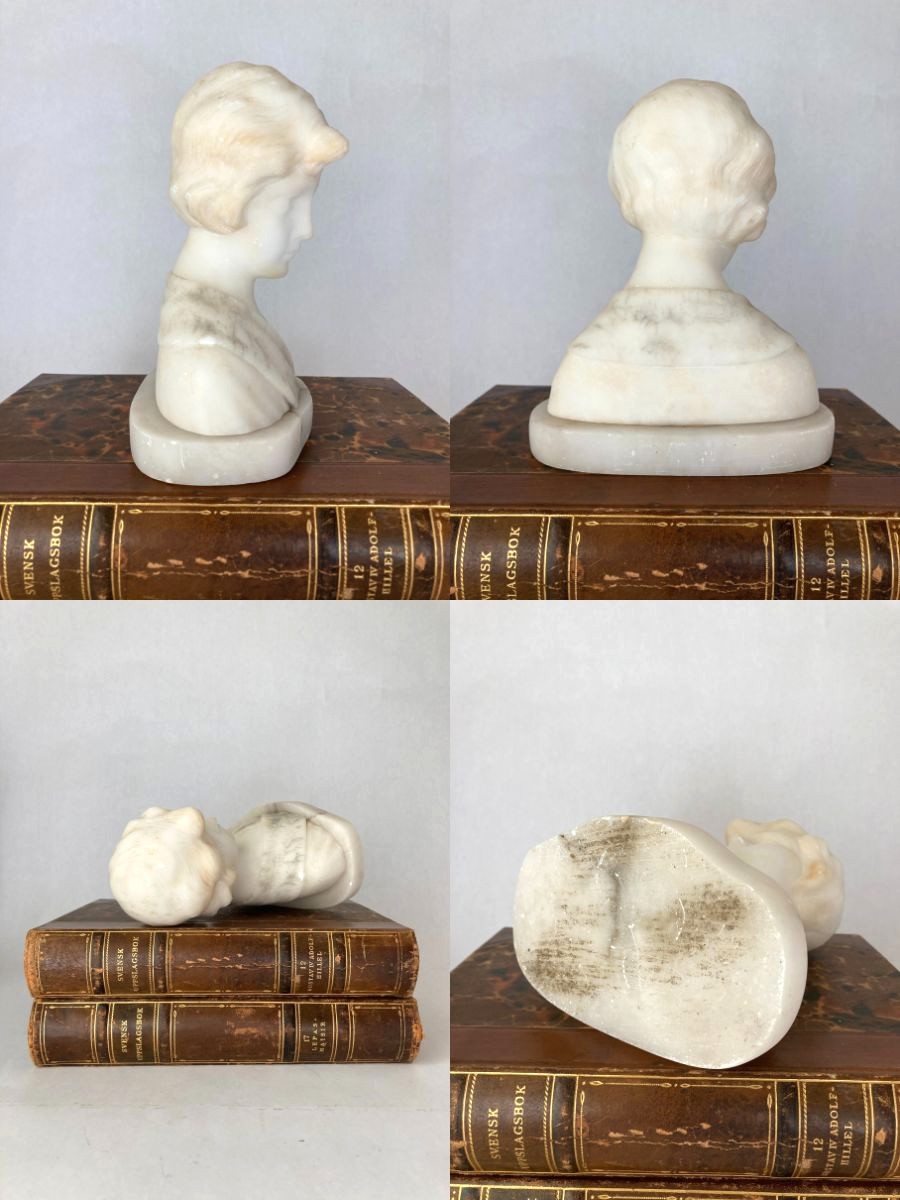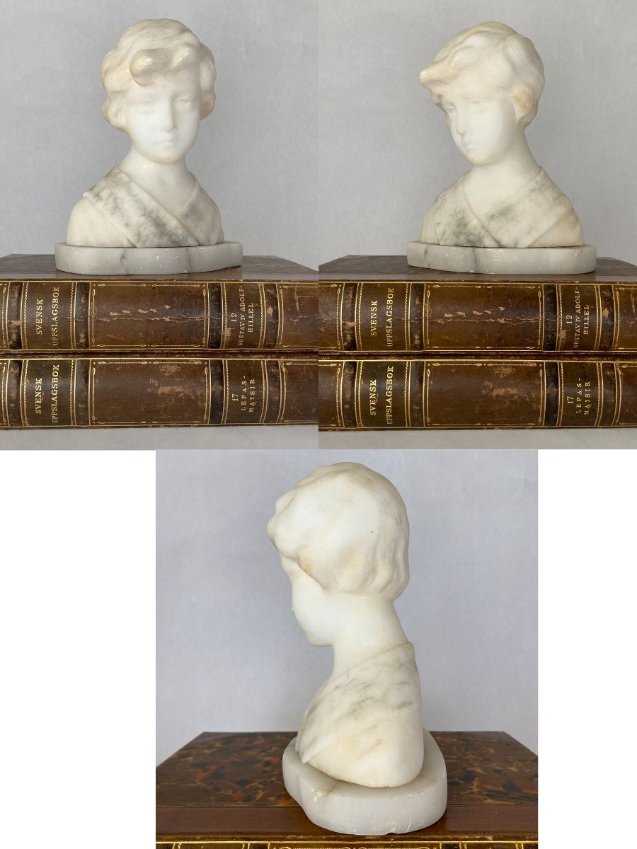 This delicately carved bust depicts a young girl with softly styled hair and classical drapery across the shoulders with light veining. Created from translucent alabaster, the sculpture showcases the refined craftsmanship popular in decorative arts of the late 19th to early 20th century. Alabaster was a favored medium for its smooth texture and luminous quality, allowing artisans to render fine details with a sense of warmth and realism. Often made in Italy, such portrait busts were commonly sold as decorative objects or Grand Tour souvenirs, intended to bring a sense of neoclassical refinement into the home. The serene expression and timeless styling reflect the influence of ancient Greco-Roman sculpture, reinterpreted through a romantic, Victorian-era lens. The sculpture measures 6.75″ tall x 5.75″ x 3.5″ at the base and weighs just under 4 lbs. Very good preowned vintage to antique condition with a few minor nicks consistent with age and prior use. Lovely shelf-styling piece or addition to a collection of classical busts or sculptures.
