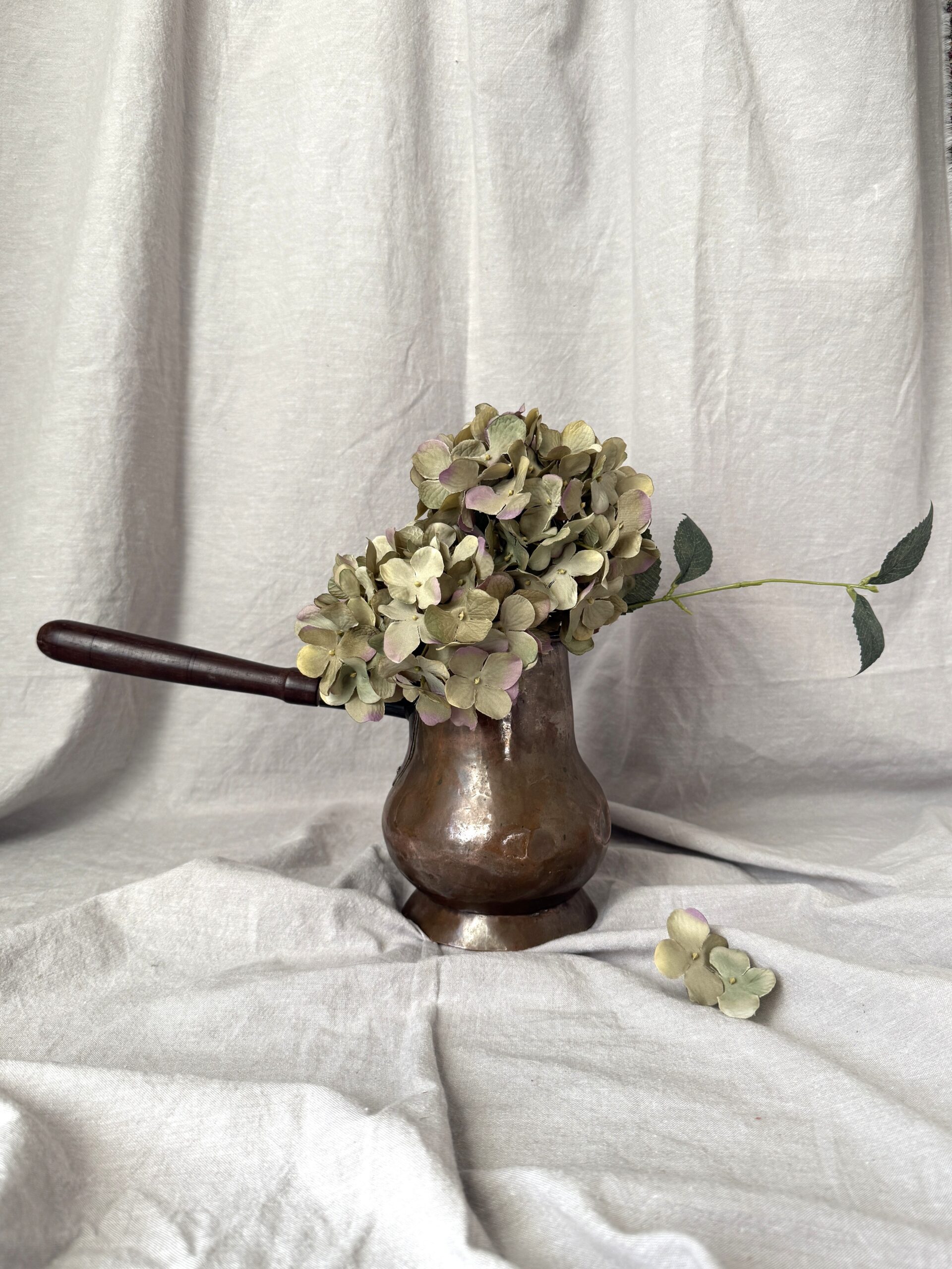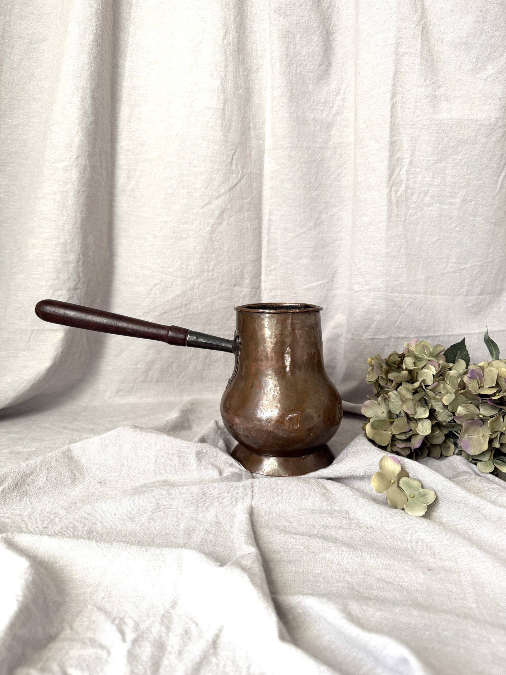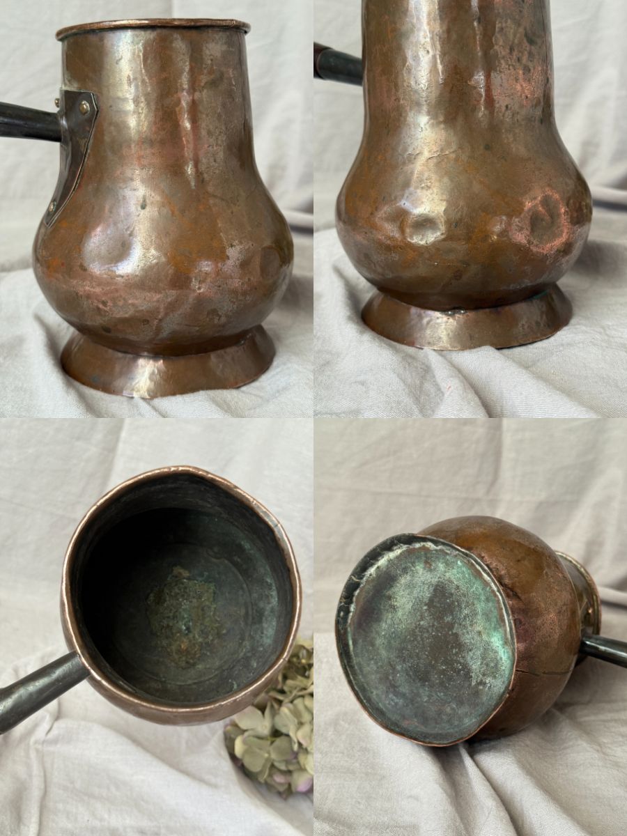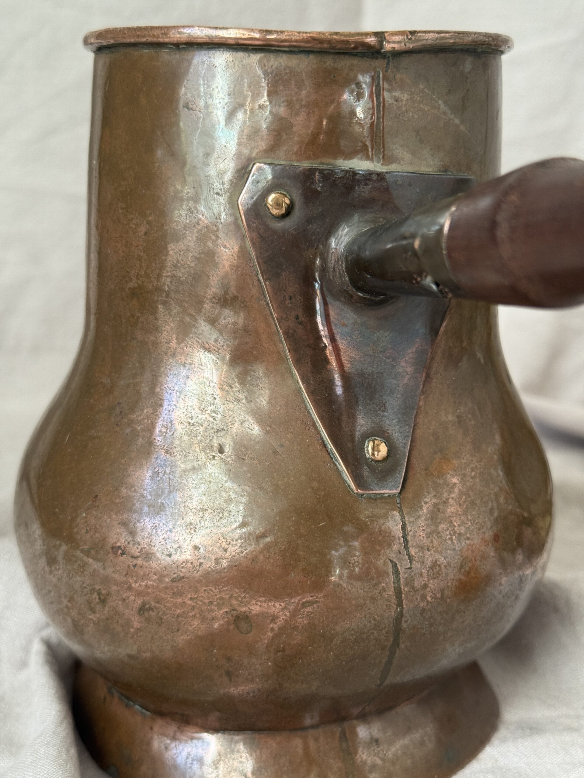 Vintage to antique copper chocolate melting pot with wooden handle. Handcrafted, lots of patina; may polish to a bright shine if that look is preferred. It measures 6-1/8″ tall x 4″ in diameter at the rim x 4-5/8″ in diameter at the base; including the handle, it’s 12-5/8″ long. There are a few dents consistent with age and previous use. Overall, good used vintage to antique condition with a few dents; not watertight. There are remnants of green floral adhesive and foam inside, which I was unable to remove. Great addition to a collection of old copper vessels.