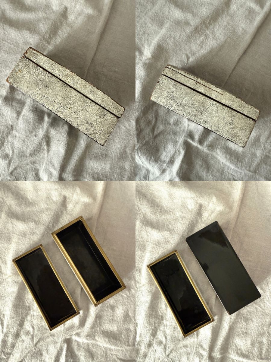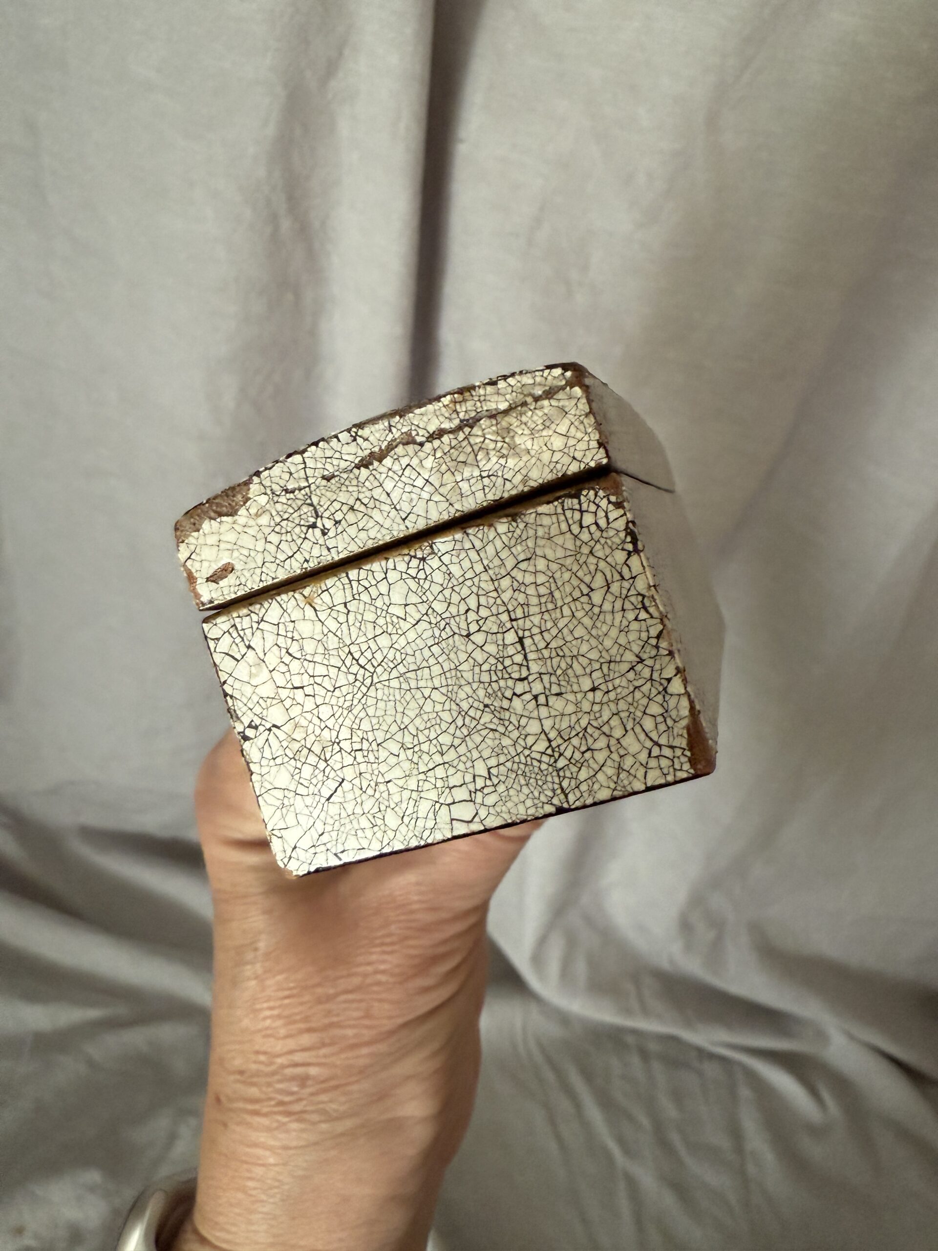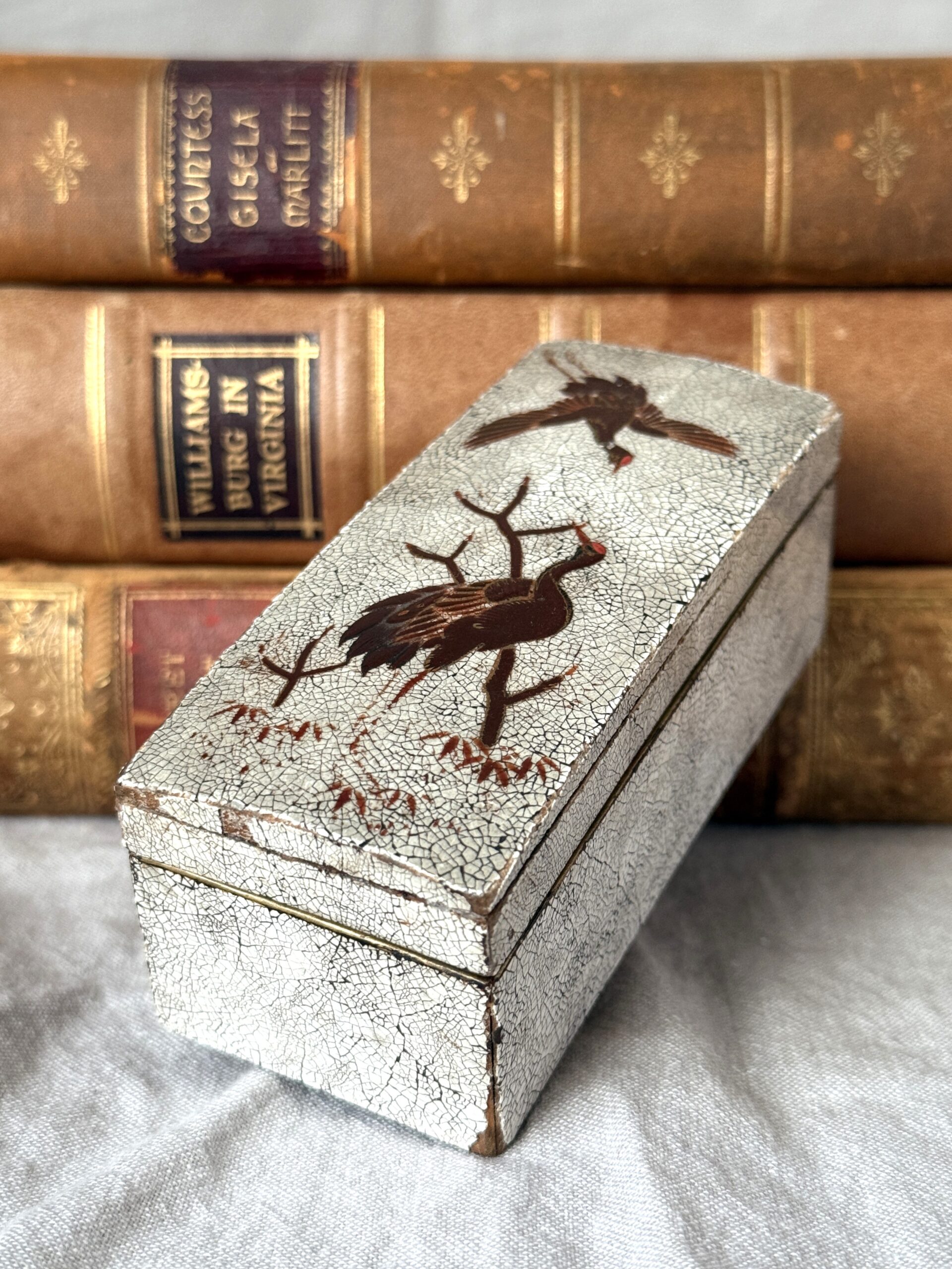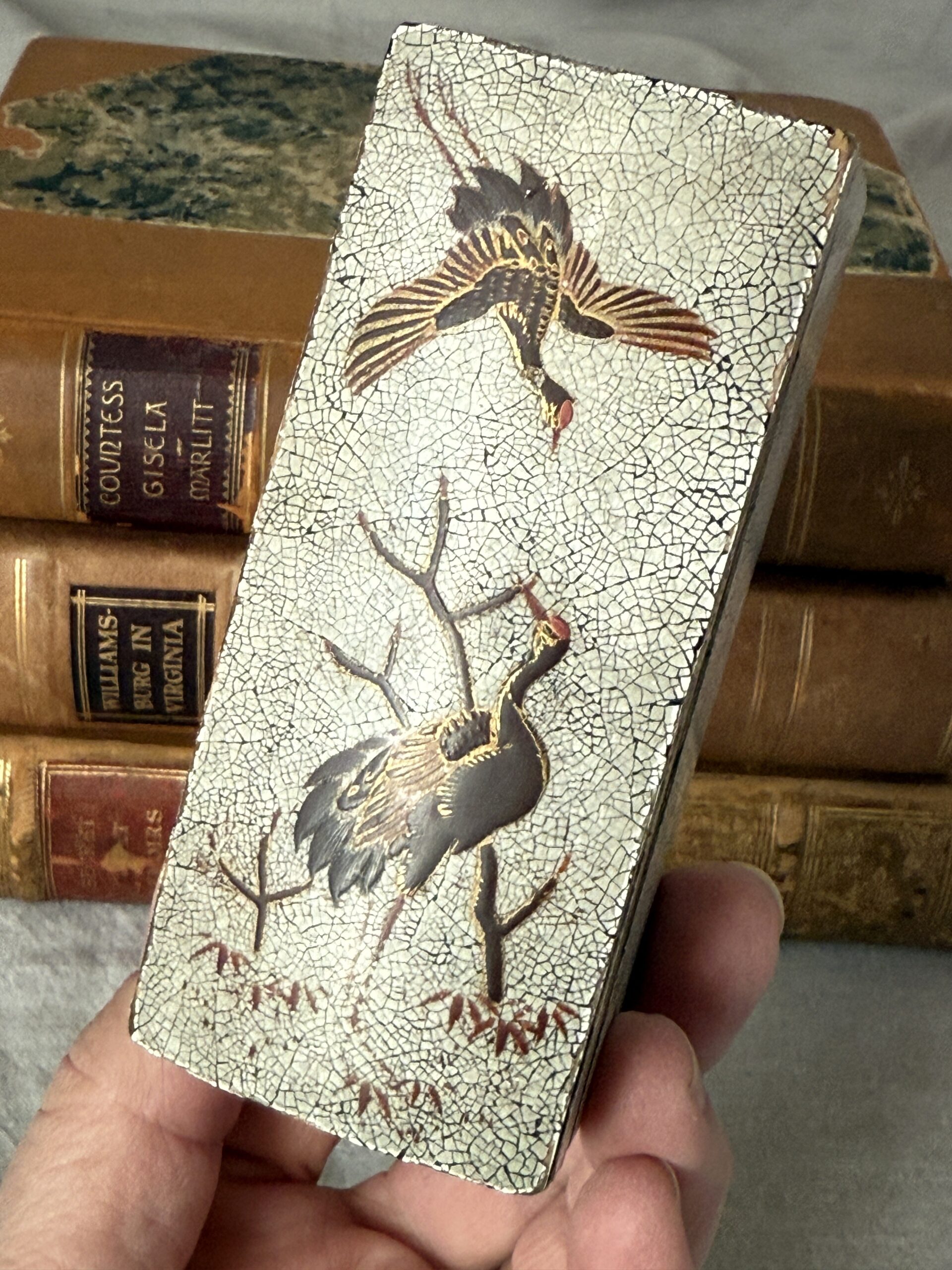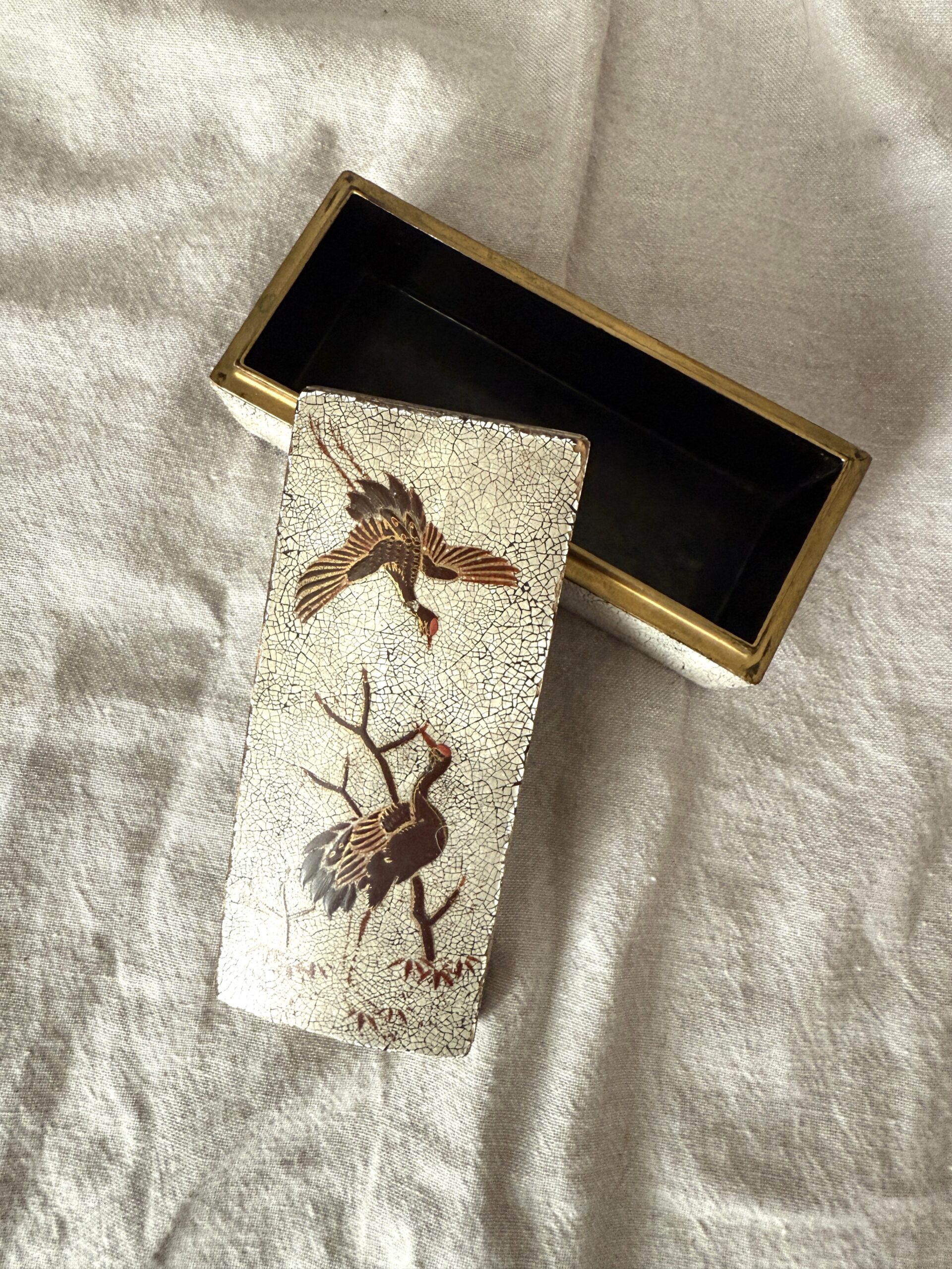 Vintage to Antique Eggshell Crackle Lacquerware Box with Flying Cranes Possibly from Japanese Meiji Period 4.25″ x 1.75″