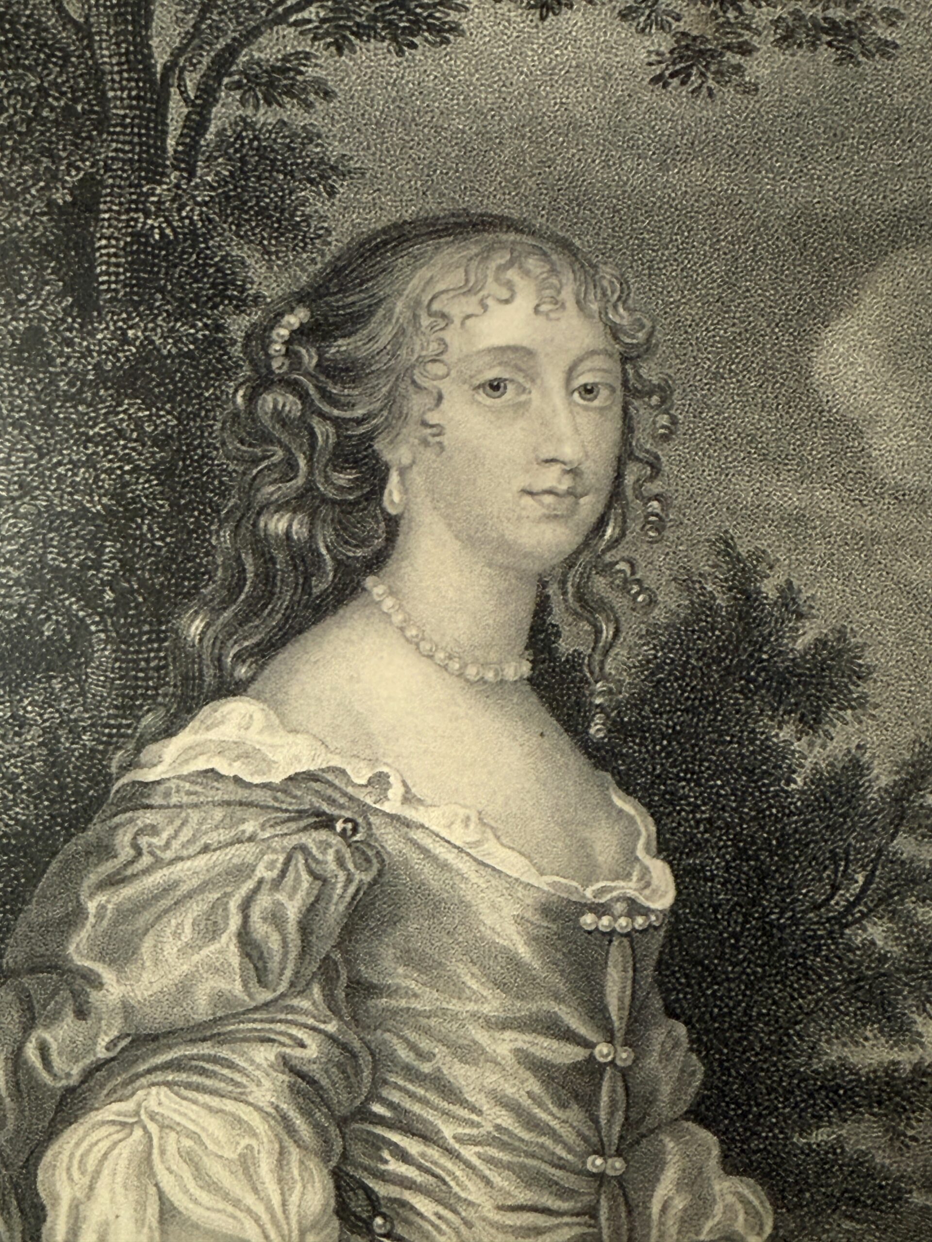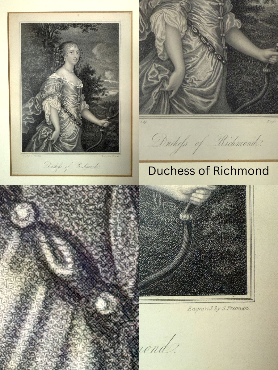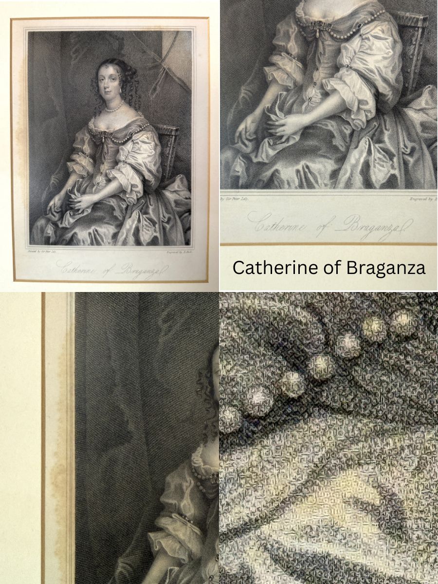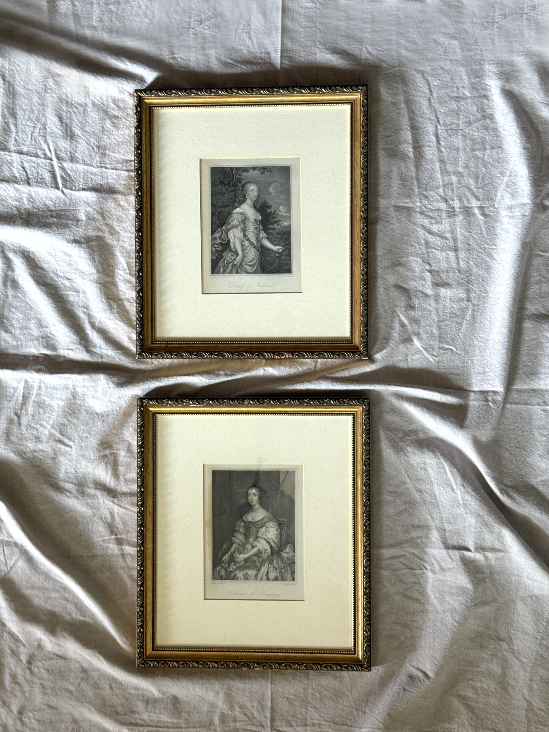 Vintage to antique framed book plate prints featuring engravings of Catherine of Braganza and the Duchess of Richmond [Frances Teresa Stewart] after portraits by Sir Peter Lely painted in the 1660s. Catherine’s portrait was engraved by B. Holl and Frances’ by S. Freeman in the 19th century. Frances is depicted holding a bow, a reference to Diana the Huntress. Both engravings were included in the book MEMOIRS OF THE BEAUTIES OF THE COURT OF CHARLES THE SECOND originally published in the 1830s–see history below. The prints offered here likely come from a later edition of the book, as they are printed on glossy paper which wasn’t developed until the 1880s – 1890s. I refer to them as “vintage to antique” since I don’t know the publication date of the books in which these particular prints appeared. They are framed under glass and buff, gold edged-mats in ornate gold frames from the last quarter of the 20th century, with new dust covers. Overall measurements are 15-3/8″ x 13-3/8″. Excellent preowned vintage/antique condition. Note that Catherine’s portrait shows some foxing along the left margin.