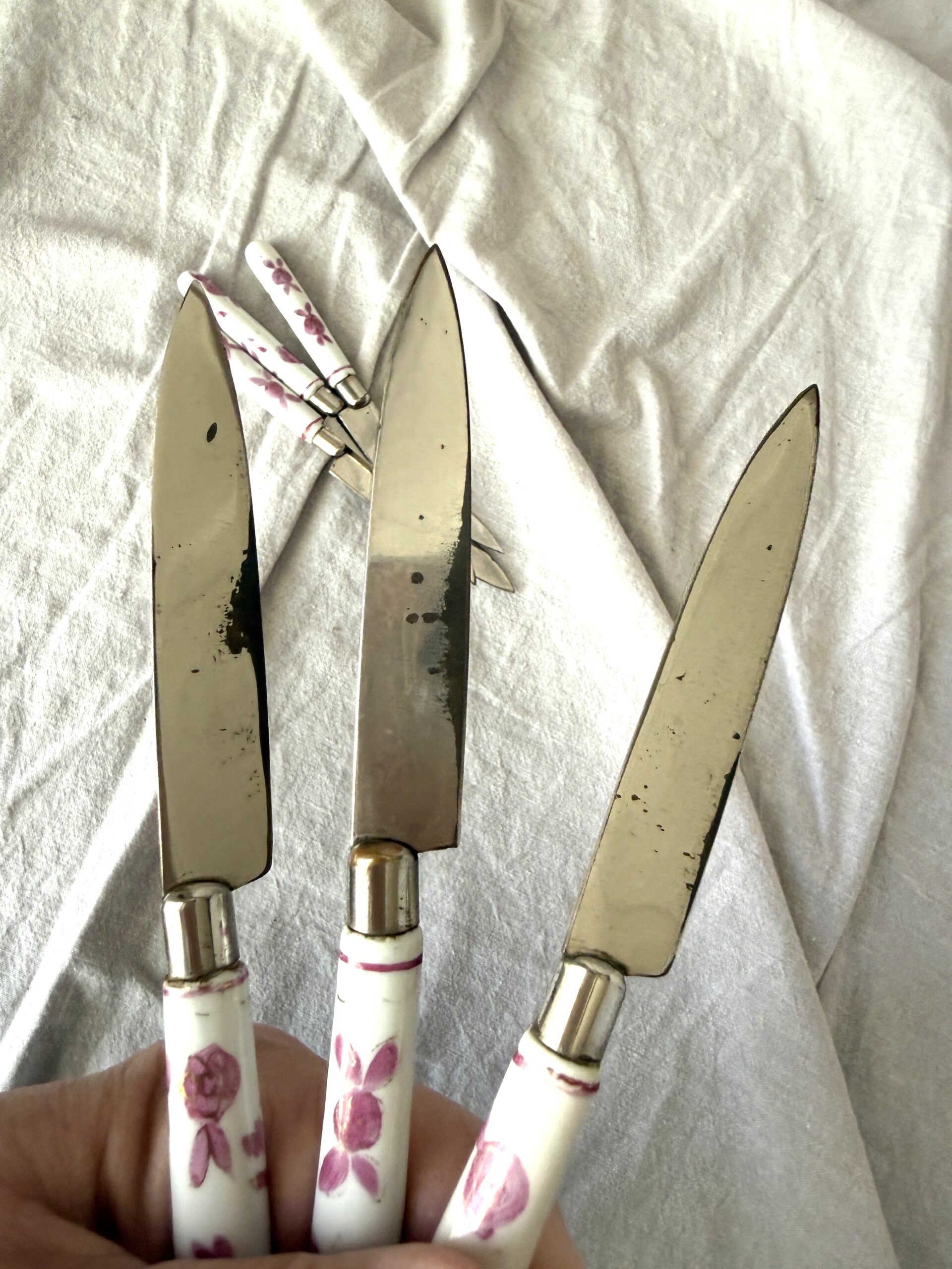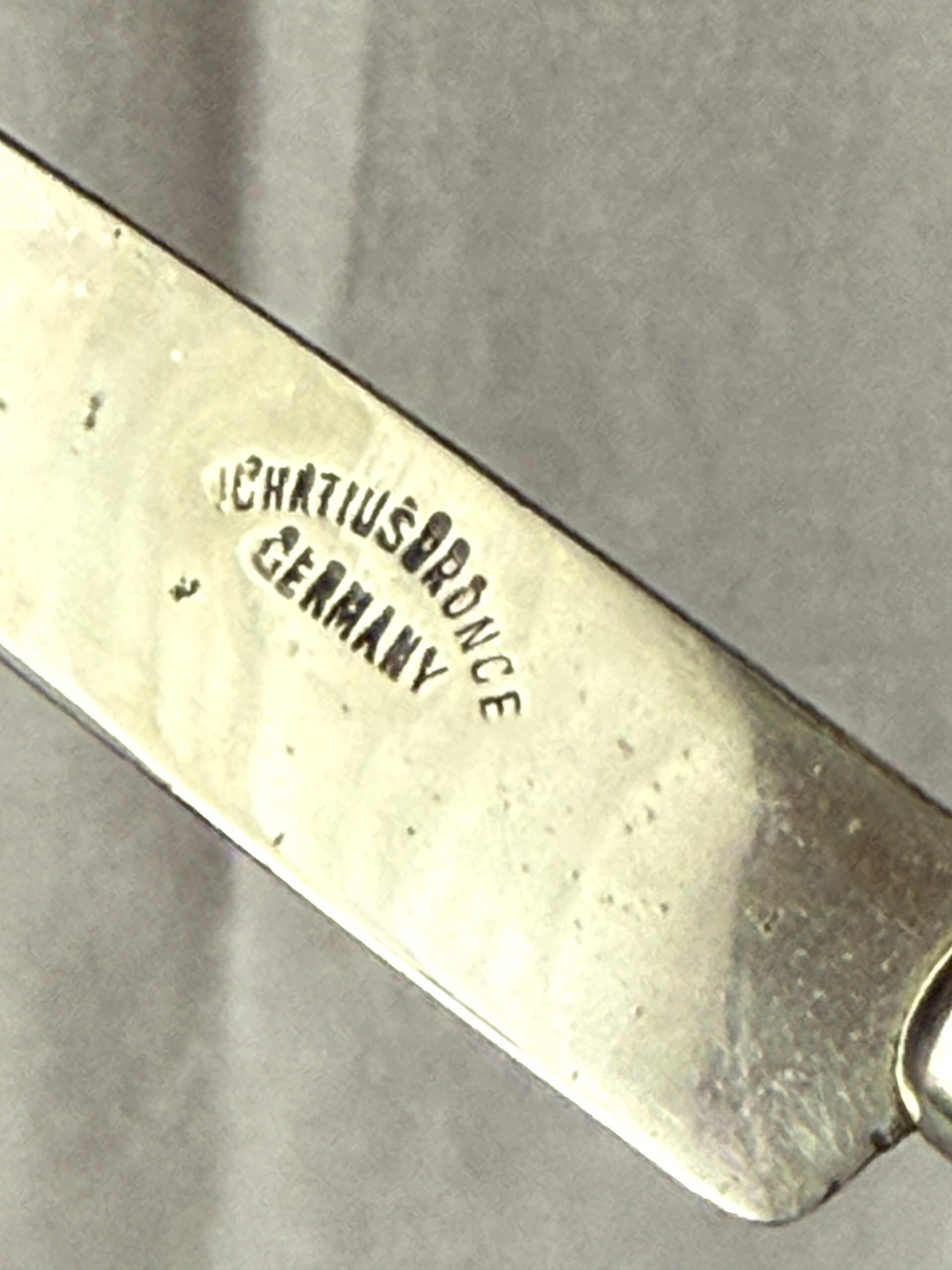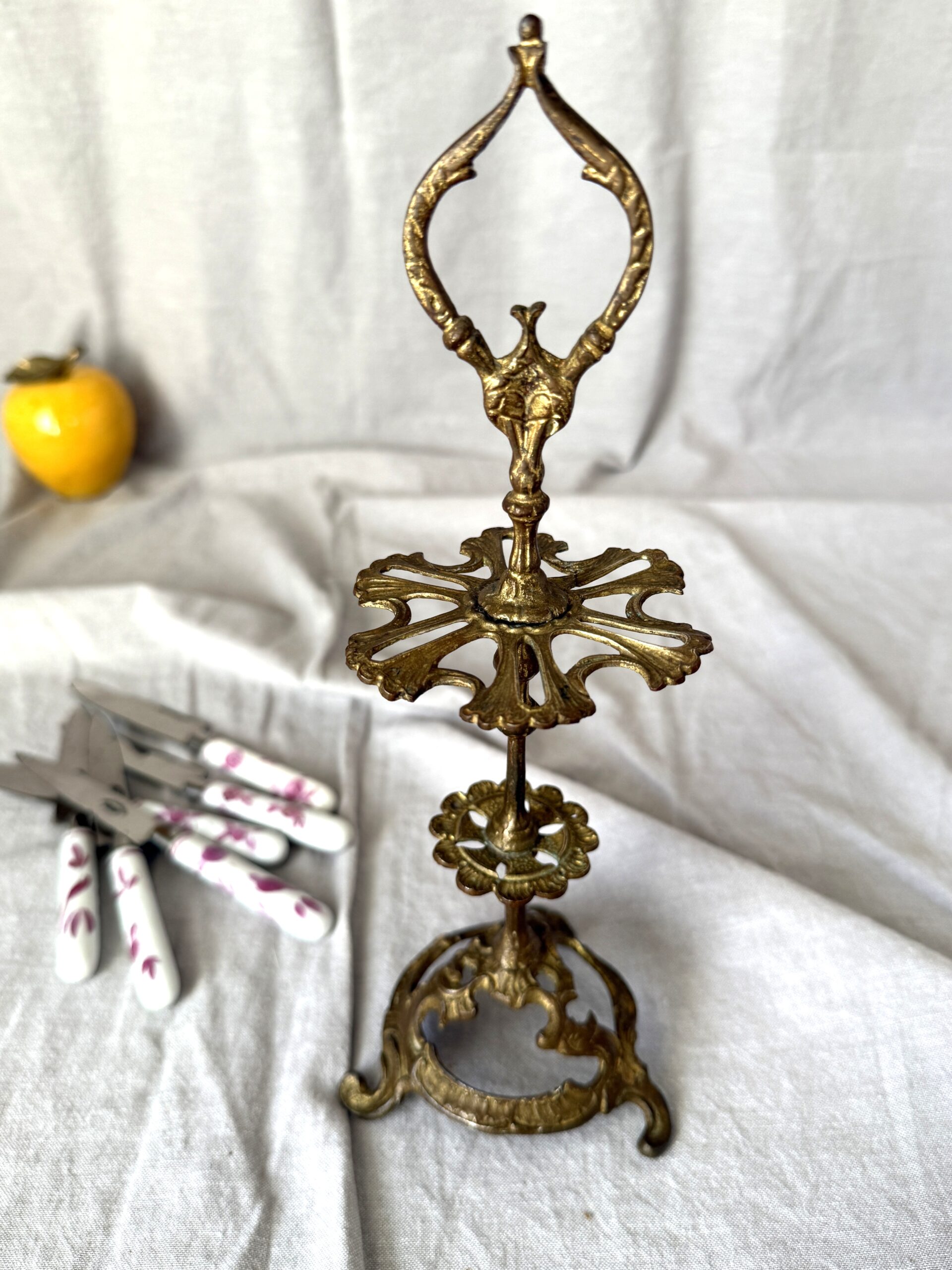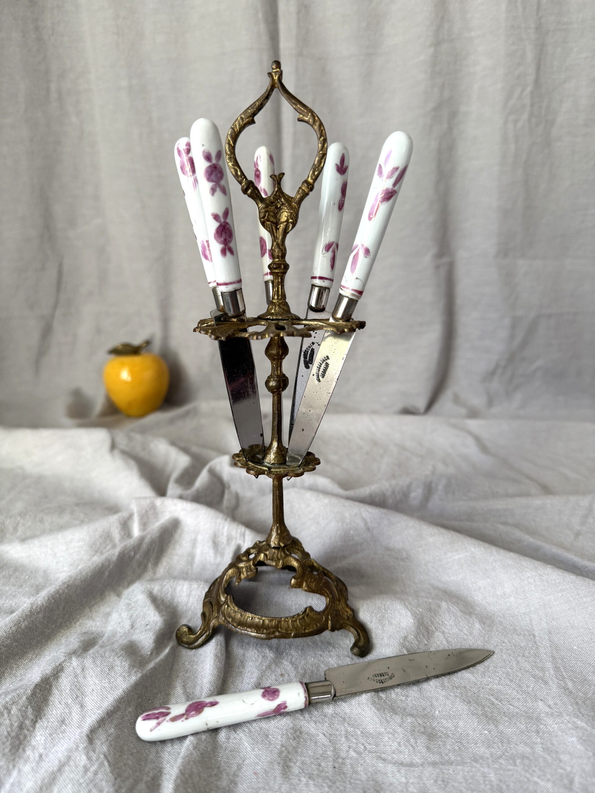 Vintage to antique porcelain-handled fruit knives with ornate brass or bronze stand. The knives are marked “Uchatius Bronce, Germany.” [“Uchatius Bronce” is bronze alloy of steel & copper developed in the 19th century by Austrian artillery maker Franz von Uchatius (1811 – 1881)]. The knives measure 6.25″ and the stand is 10.25″ tall. There is wear on the knife blades consistent with age, prior use and the nature of the metal–see photos. The stand is in excellent condition. I believe these date from the 1910s to 1920s.