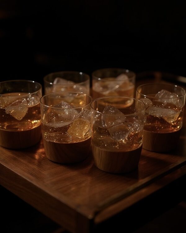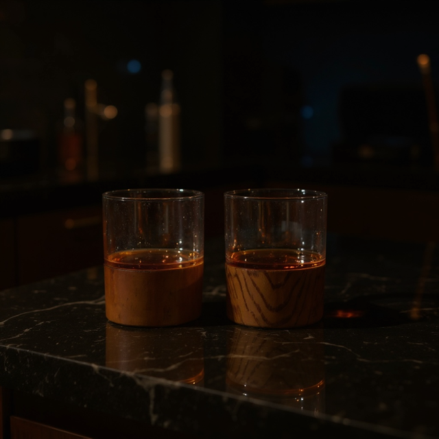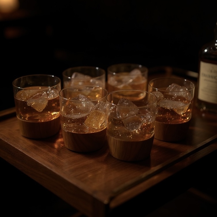 Set of two spirit glasses with teak wood bases. All are in good condition with varying wood grains. No cracks in glass or wood.