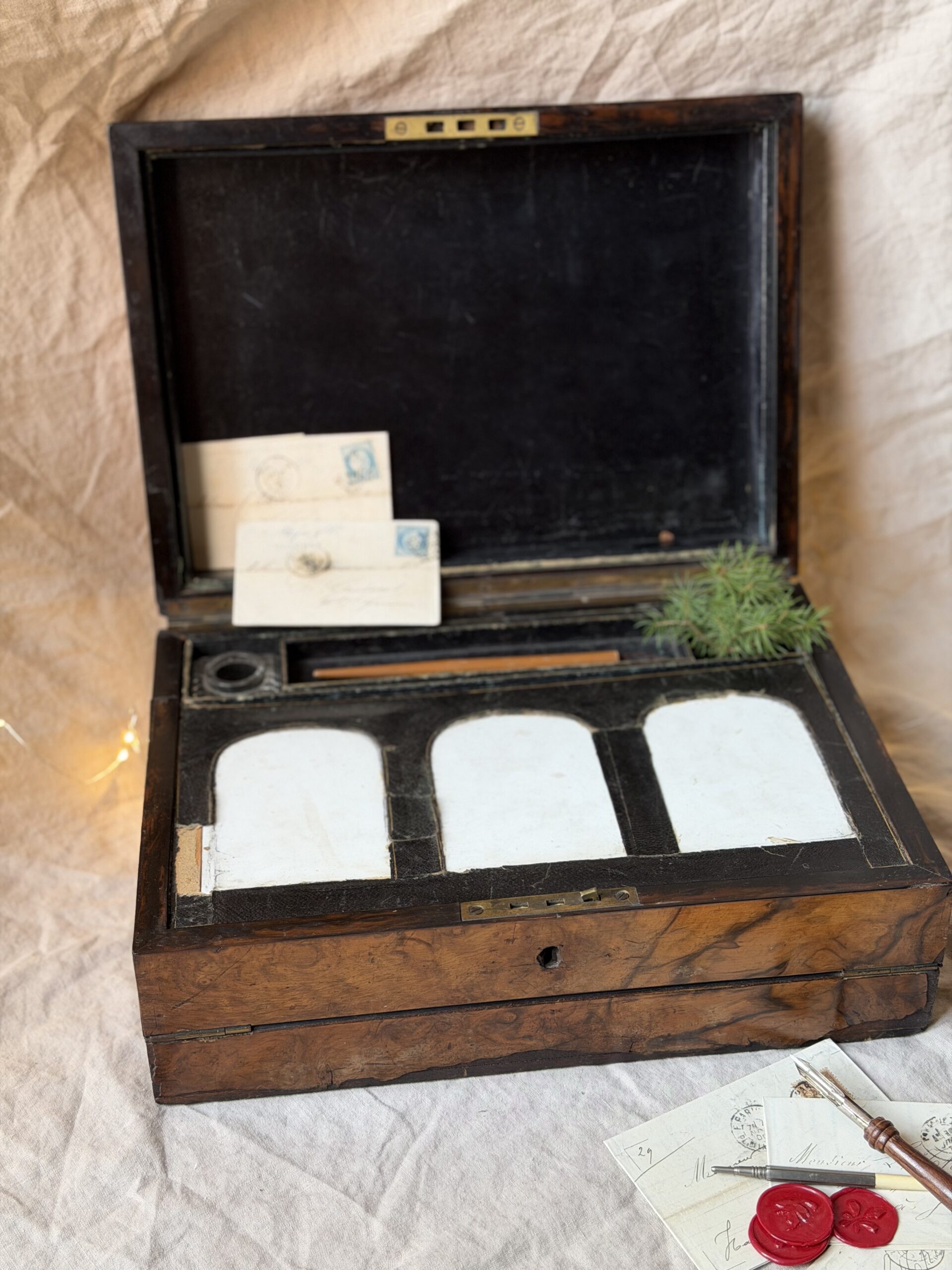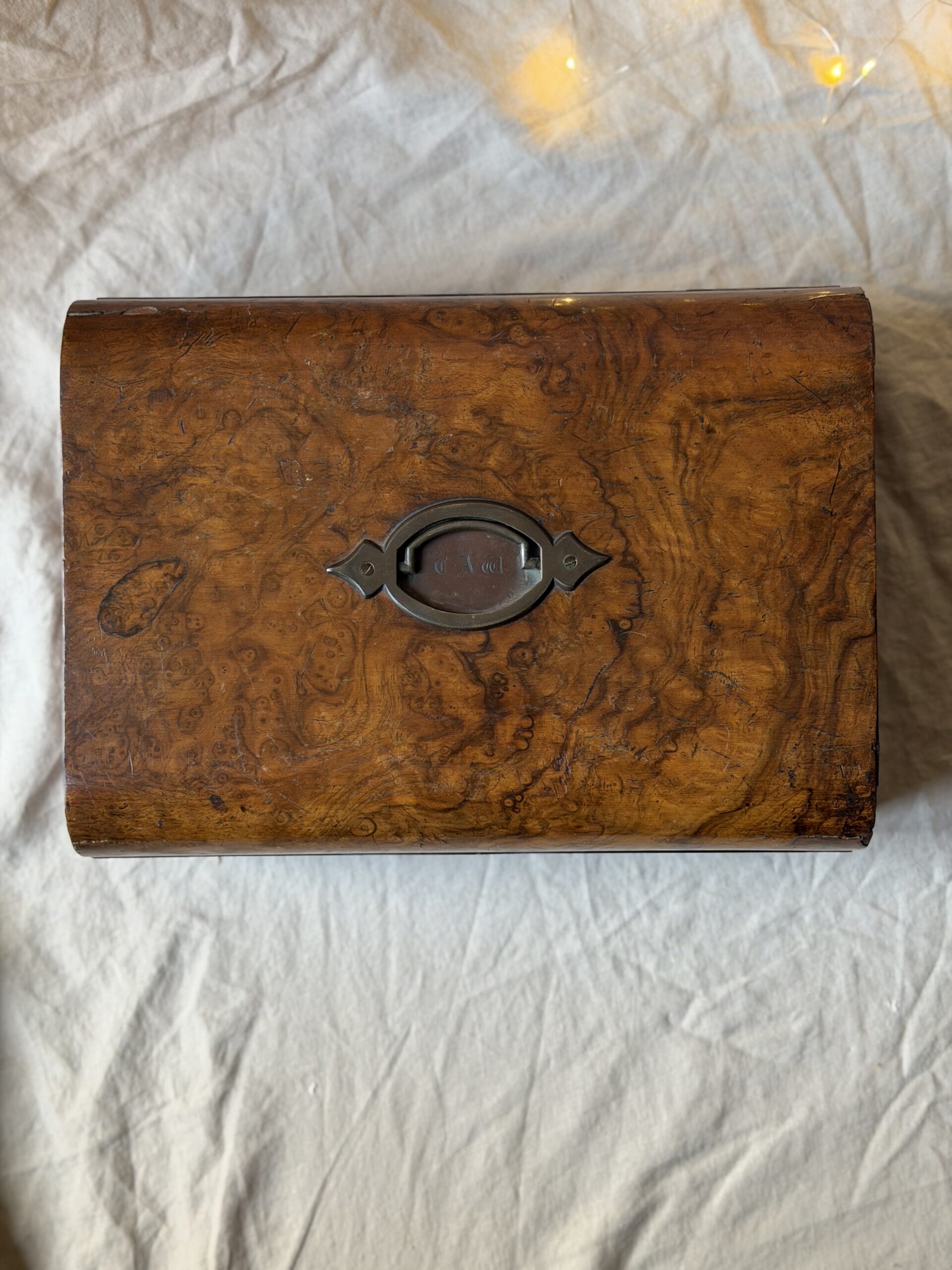 This antique writing box is wrapped in a warm swirl of Carpathian elm burl wood veneer. The piece opens to reveal its inkwell compartment and spaces for letters and pens. The three pale panels were once fitted with blotting papers. The piece also opens up to allow room for more storage, perfect for letters, pressed flowers and supplies. Beautiful engraved initials on the mounting plate of the drop handle.