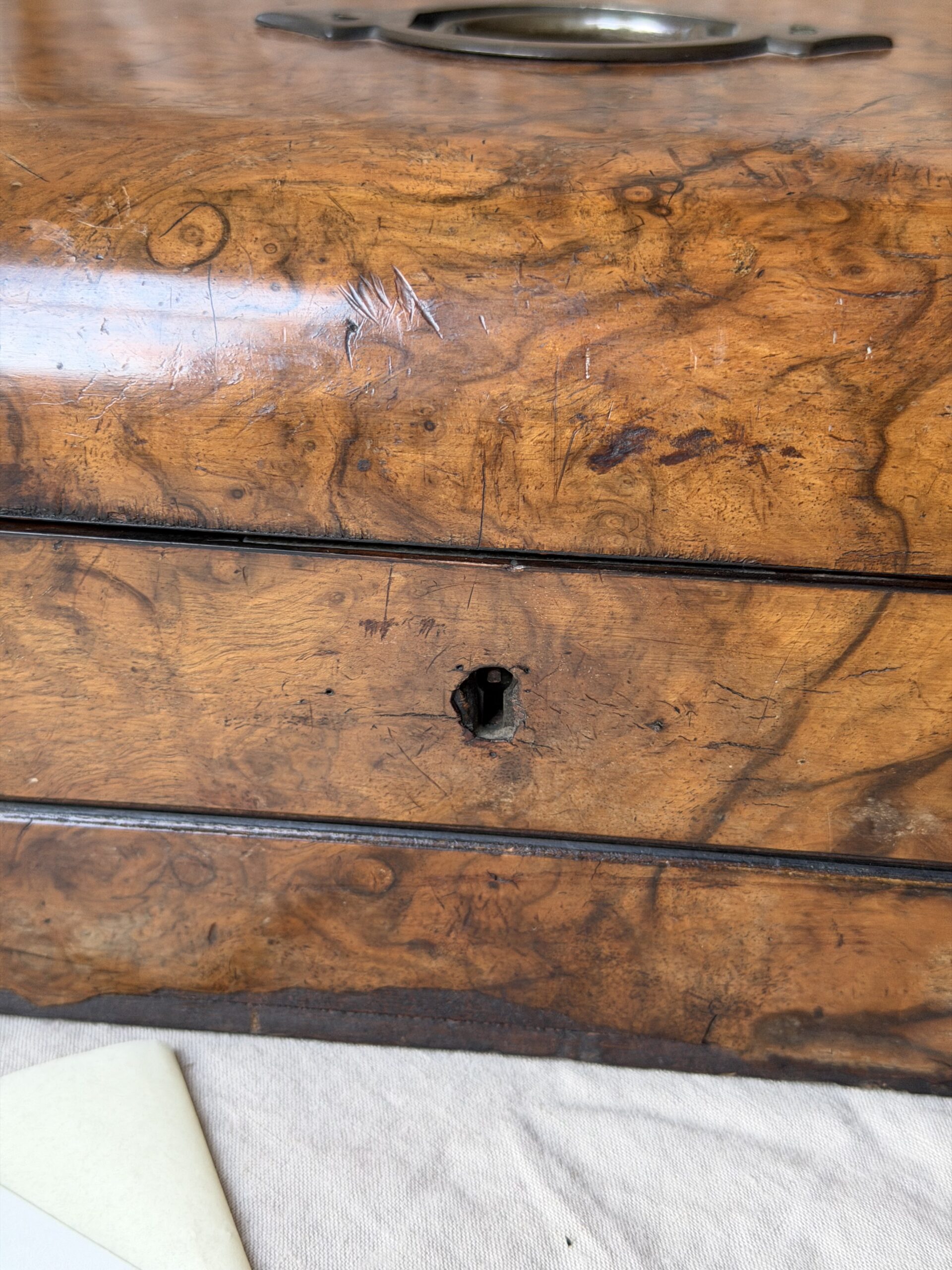 The writing box is antique and retains traces of a life well lived. There is light wear that tells of years of correspondence. Please see photos for details: some chips in veneer and tear of leather interior near the panels. Lock appears broken and key is absent.